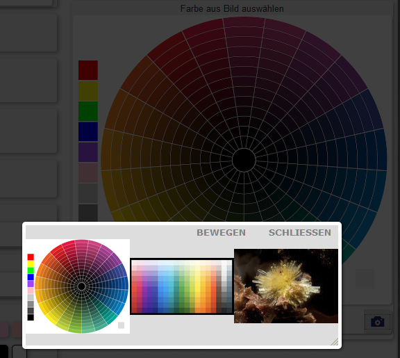Hierzu können Sie auch ein vorher hoch geladens Bild nutzen, in dem Sie z.B. das Mineral mit dem Farbwähler anklicken und die damit ermittelte Farbe speichern. Dies bietet auch Farben blinden Personen die Möglichkeit eine Farbe auszuwählen. Das entsprechende Objekt anklicken und die Farbe abspeichern.