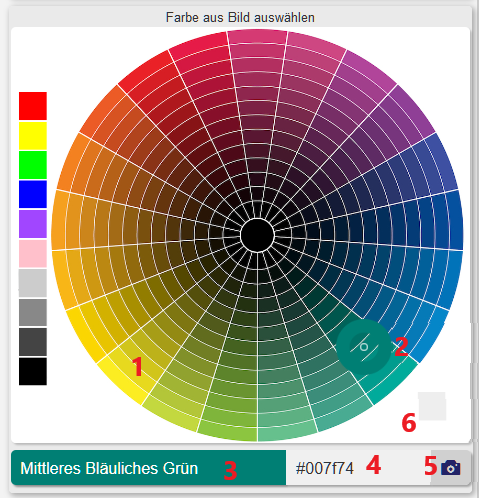 Im Bild sehen Sie eines der möglichen Farbauswahlbilder. (1) Ein Farbkreis, (2) Der Farbauswahl Kursor, (3) der Name der ausgewählten Farbe, (4) der ermittelte Farbcode, (5) Der Auswahlknopf für weitere und eigene Bilder, (6) Die Fläche um “farblos” auszuwählen.