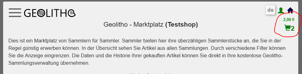 Hinter jedem Verkaufsartikel findet sich ein dunkelblaues Warenkorbsymbol mit einem + davor. Klicken Sie darauf wird der Gegenstand in Ihren Warenkorb gelegt. Dies geht auch als Gast. Sie sehen Ihren Warenkorb und die Anzahl der Artikel sowie den Wert oben rechts. Eine Bestellung ist als Gast nicht möglich. Bei der Anmeldung wird der Inhalt des Gastwarenkorbs Ihrem Warenkorb als angemeldeter Nutzer hinzugefügt.