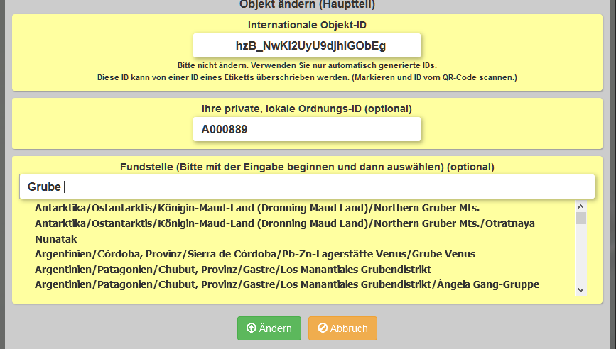At the end you can select the location where the object was found. To do this, type part of the name into the input field and select the location from the displayed list with the mouse or your finger.