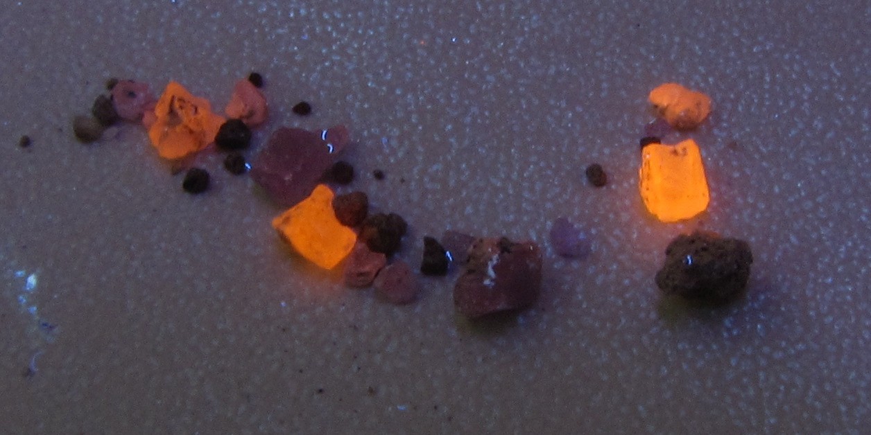@Uwe: Habe meine Stufen aus der Eifel mit einer handelsüblichen Langwellenlampe (Falschgeldprüfer) zum Leuchten gebracht. Seltsamerweise aber nicht so deutlich die aus den Phonolithen des Kaiserstuhls, bzw. die Fluoreszenz ist so schwach, dass sie von dem schlecht gefilderten Licht (viel violett) überstrahlt wird. Auch ein Stück von Hammerunterwiesenthal schimmerte zwar rotviolett, aber das könnte genauso gut das violette Lichtgewesen sein.