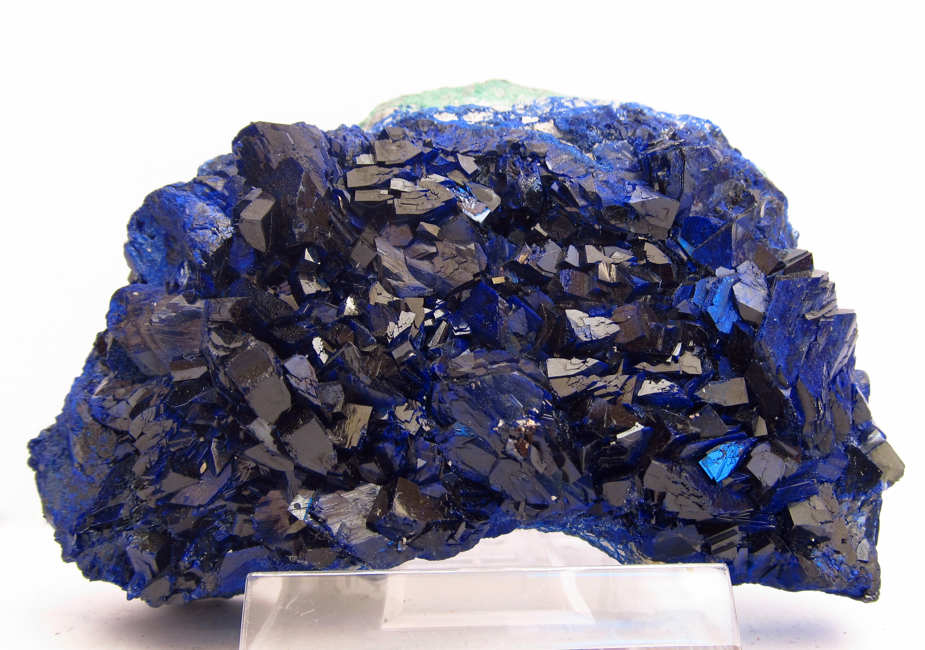 Keine Tsumebqualität aber eine der besten Azuritstufen, die ich aus der DR Kongo kenne. Der Kupfergürtel ist zwar bekannt für hervorragende Kupfermineralien - Azurit kam bis zu dem sehr limitierten Fund von Kinsevere um 2012/13 aber nur in mäßiger Qualität vor. Ich habe meine Kongosammlung zwar bis auf <10 Stufen verkauft, diese Stufe werde ich aber noch sehr lange behalten.