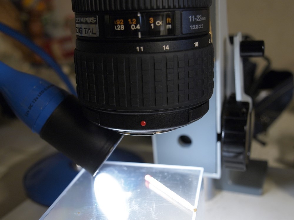 Da mich meine Mikroskopfotos nicht überzeugt haben (GSM Zeiss  Jena) habe ich nach einem Objektiv gesucht. Es soll ja möglichst wenig Linsen haben, eigentlich kein Weitwinkel und schon gar kein Zoom. Also habe ich mein Zoom Weitwinkel in Retrostellung vor meine E-510 gehalten und siehe da, die Qualität ist gar nicht so schlecht wie erwartet. Nach dem ich mit die entsprechenden Adapterringe besorgt habe habe ich nun die ersten Testfotos gemacht. Weil es ein Weitwinkel mit für eine Spiegelreflexkamera ist hat man auch 3,5cm Platz zum beleuchten (Auflagemaß).