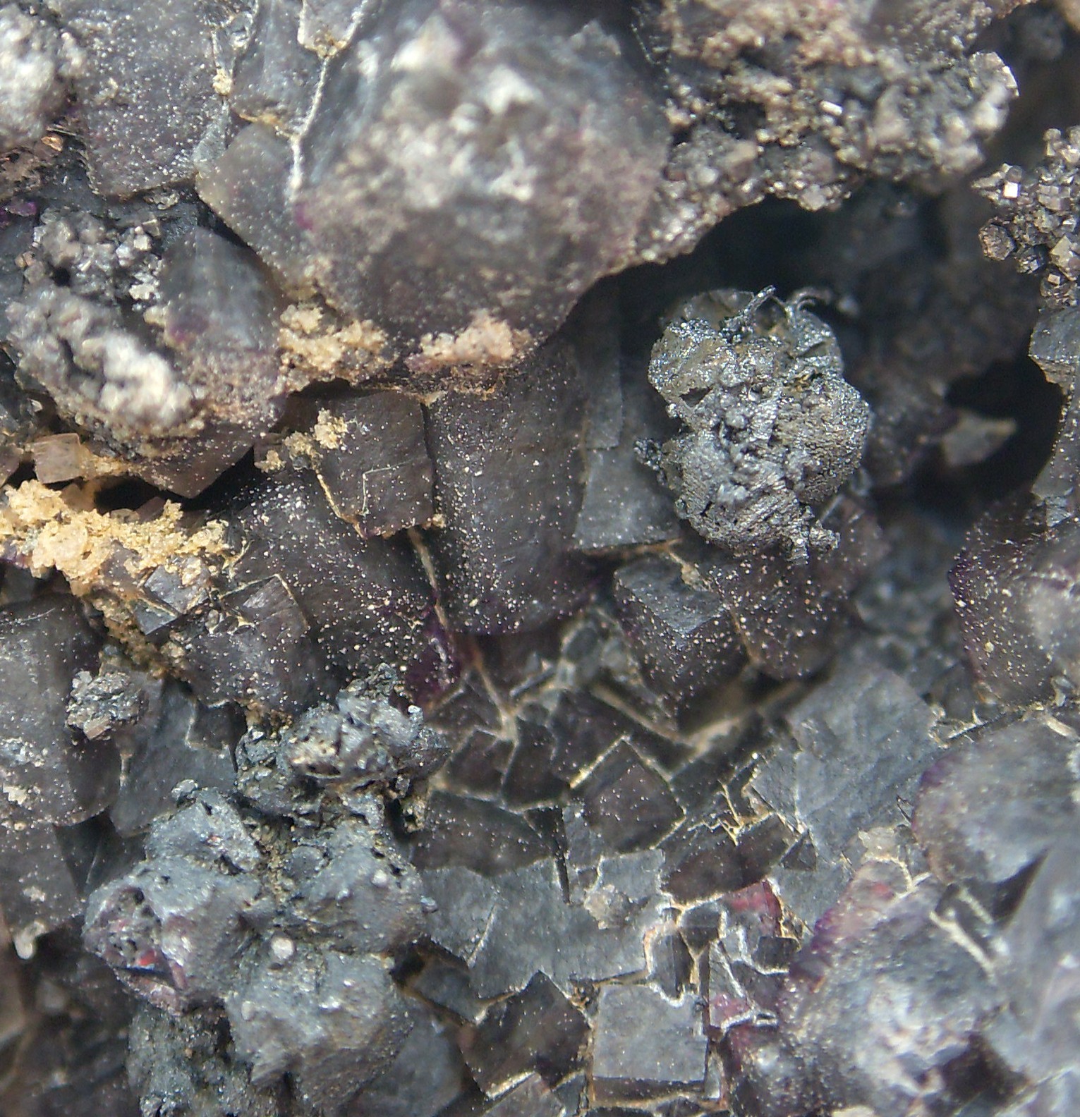 Nun glaube ich, dass die fliederfarbenen Kristalle Fluorit auf Quarz (?) sind und die silberfarbenen Einstreuungen besagtes Argentit oder sogar Silber.