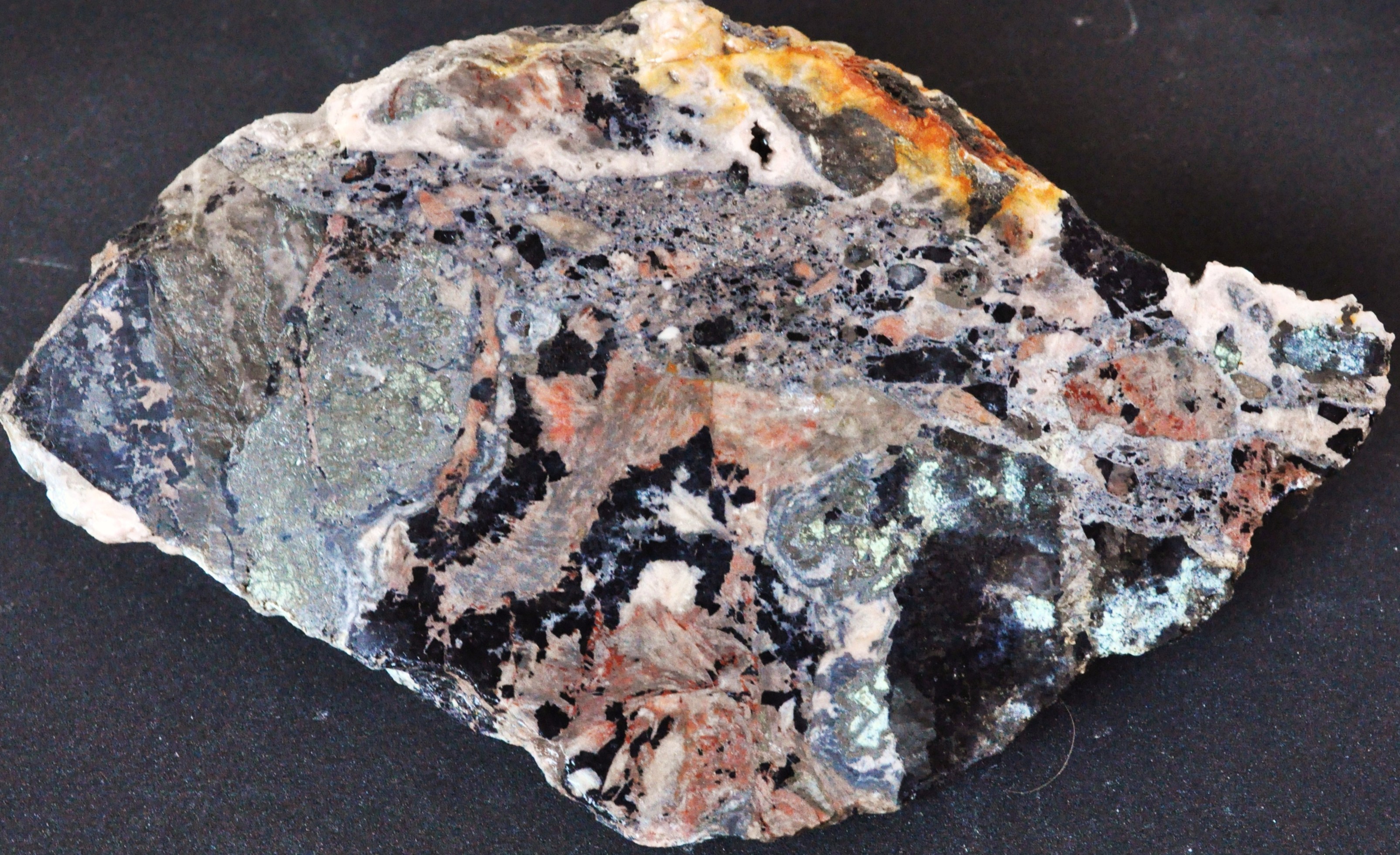 Das Stück ist ein Reicherzstück aus der BiCoNiAsUAg-Formation. Das Stück war ursprünglich etwa 20 x 18 cm groß. Da ich aber wissen wollte, wie da Stück von Innen aussieht, habe ich den hinteren Teil der Stufe abschleifen lassen. Das Resultat ist doch recht ordentlich.