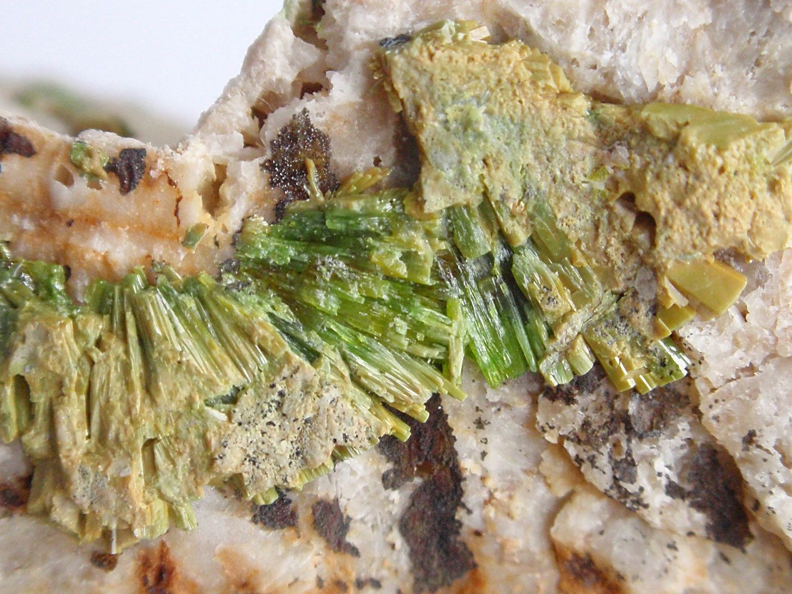 Hier mal ein (nicht lexikontaugliches) Bild meines Pyromorphit-Belegfundes (farblose bis leicht bräunliche Kristalle meist um 1 mm bis 2 mm):