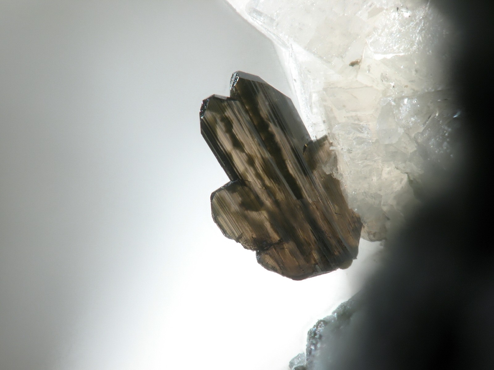Rauchquarzgwindel: 4,5 cm hoch, mit Einschlüssen von Amianth bis 1,5 cm an der Basis. Gefunden am 15.08.2009 am Crap Ner in Sumvitg (Schweiz)