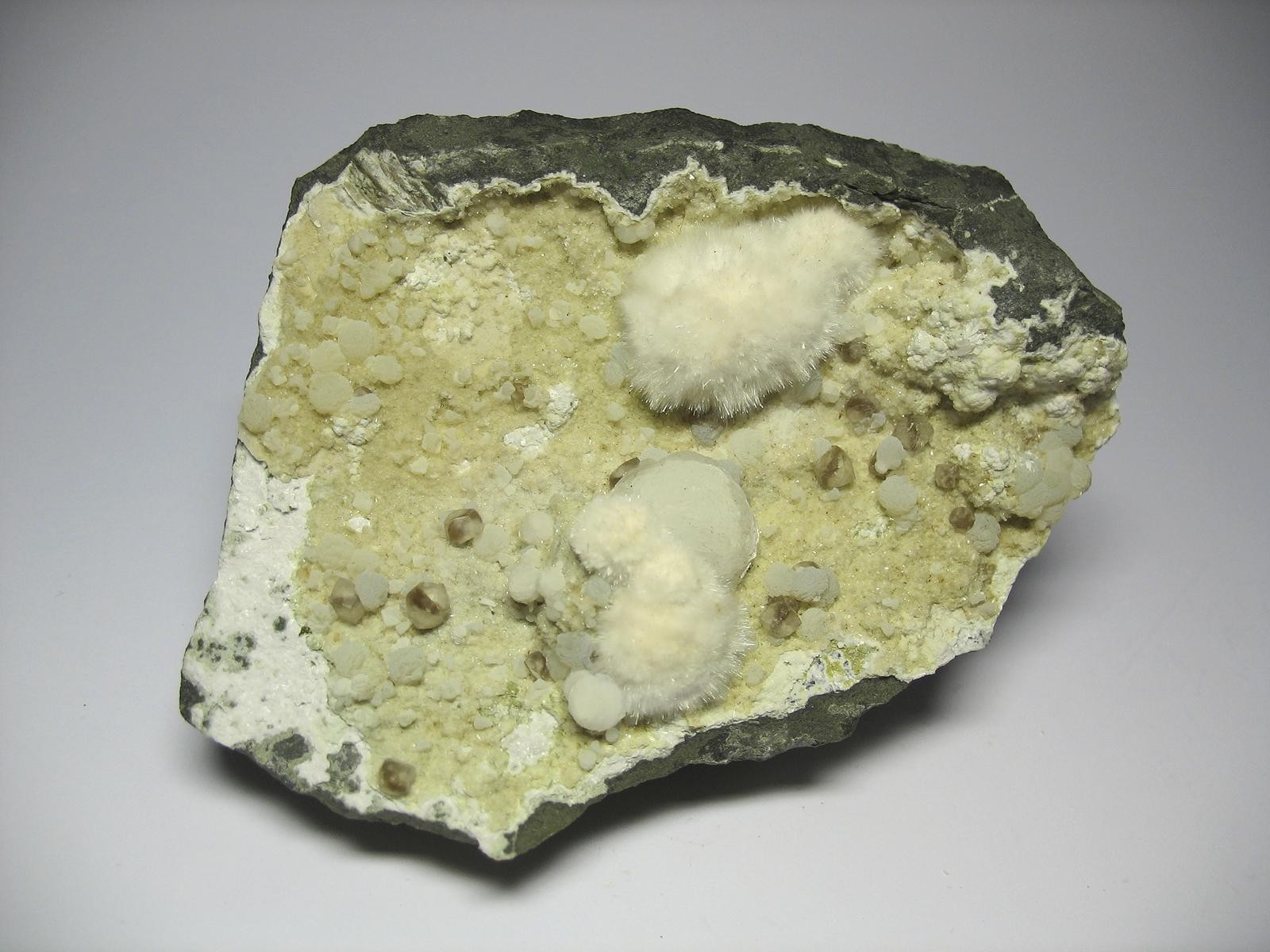 bei nachfolgender Stufe rel. großen Stufe ( 19 * 10 * 6 cm) müsste es sich bei den nadelig-wattigem Mineral um Okenit handeln. Es ist auch ein wenig Calcit am Stufenrand zu finden. Die Stufe soll aus Indien stammen. Die Matrix ist m.E. Basalt. Um was könnte es sich bei den kugeligen Mineralien handeln? Gyrolith? Was könnte der gelbgrünliche Belag sein?
