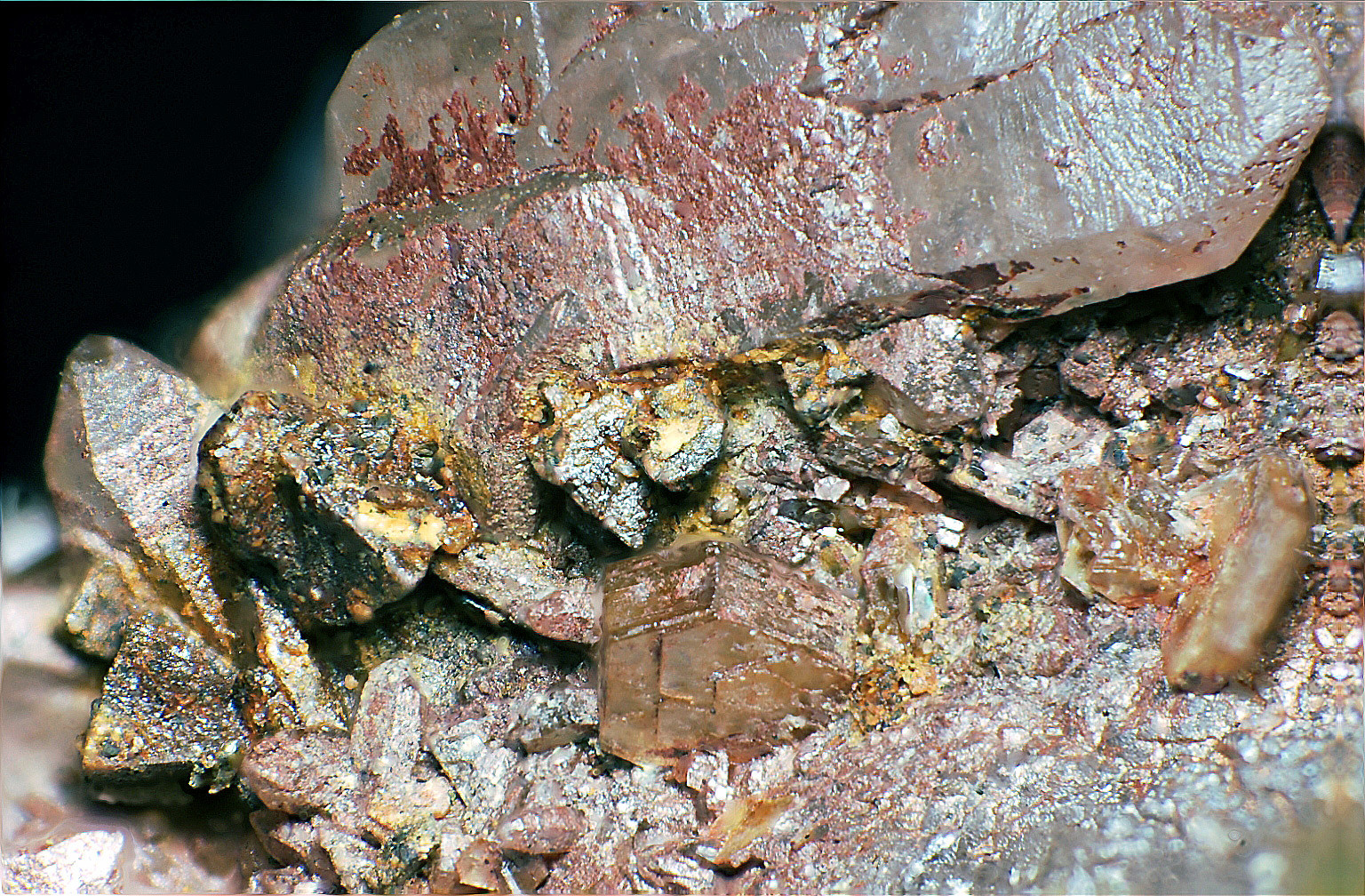 Gefunden am 16.05.2010. Beim Aufschlagen eines zunächst unscheinbaren Quarzbrockens kam eine kleine Druse zum Vorschein, die diese zum Teil rötlichen Kristalle und sagenitartige Verwachsungen führte. Bessere Funde in dieser Art kenne ich nur aus der Rauris. Bildbreite ca. 20 mm: