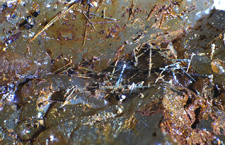 Ich hatte die Stufe nochmal eingehend untersucht und dabei am Rande der Druse ein sehr kleines Büschel Nadeln entdeckt, welche nicht komplett überzogen waren. Die freien Stellen sind silberfarben. Deshalb denke ich immer noch das es Wismutglanz, Galenobismutit oder Cosalit ist, mit warscheinlich Bismutitüberzug.
