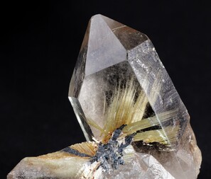 Rutil ("Venushaar") in Bergkristall aus Brasilien. Aufgenommen mit Canon EOS 5D Mark II, Tamron 90mm (2,8 Macro Di), DMF mit 3 Aufnahmen, mit Helicon gerechnet, Beleuchtung mit drei Halogen-Lampen (mit Diffusor Transparentpapier).