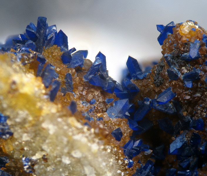 Leider ist der große Kristall rechts oben etwas dunkel geraten. Aber dies liegt zum einen an der hellen Matrix und zum anderen daran, dass die Kristalle in Natura extrem dunkelblau; fast schon schwarz sind.