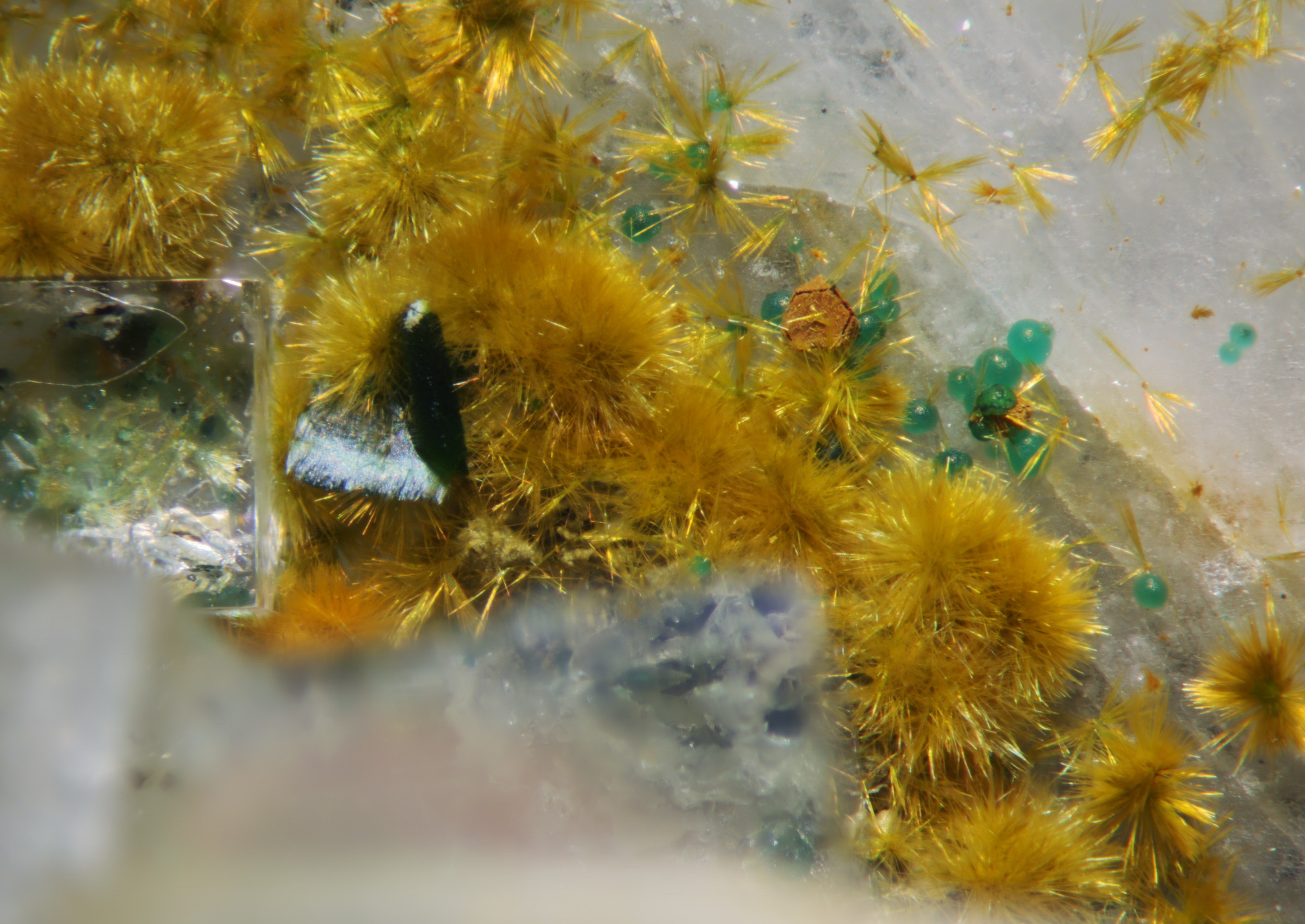 Schön, und kann man sagen in was umgewandelt? Die Kristalle machen einen "frischen" und homogenen Eindruck und sind stellenweise auch (wohl als jüngste Bildung) auf den grünen Kügelchen (Cornwallit) aufgewachsen.