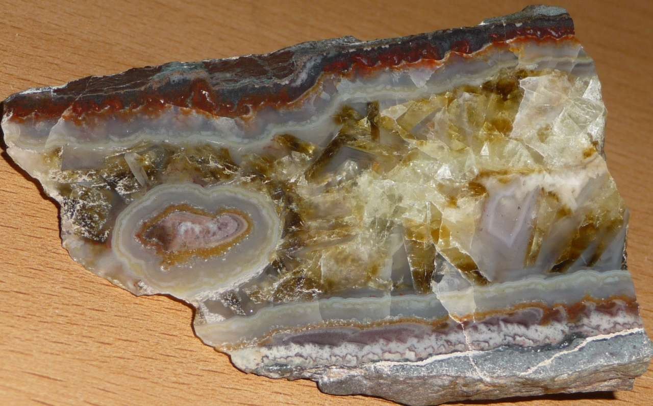 nachfolgend abgebildetes Stück hatte ich letztes Jahr in Langenthal gefunden. zwischen einfassenden Achatbändern ist befinden sich zusammengewachsen längliche, gelbgrünlich-transparente Kristalle, etwas weicher als der Achat. Um was könnte es sich hier handeln? Ich will die Bezeichnung im Archiv entsprechend ergänzen.