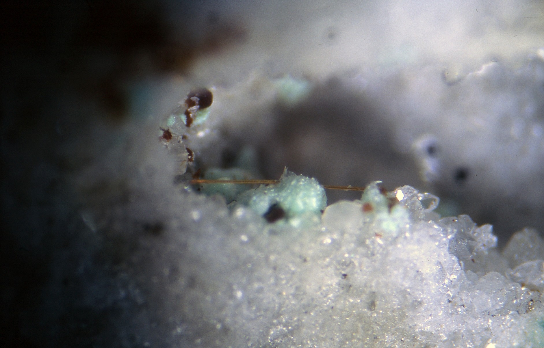 Die eindeutige Meinung war, die Nadel ist kritallin und in Auricalcit eingewachsen. Rutil dürfte aber ausscheiden.