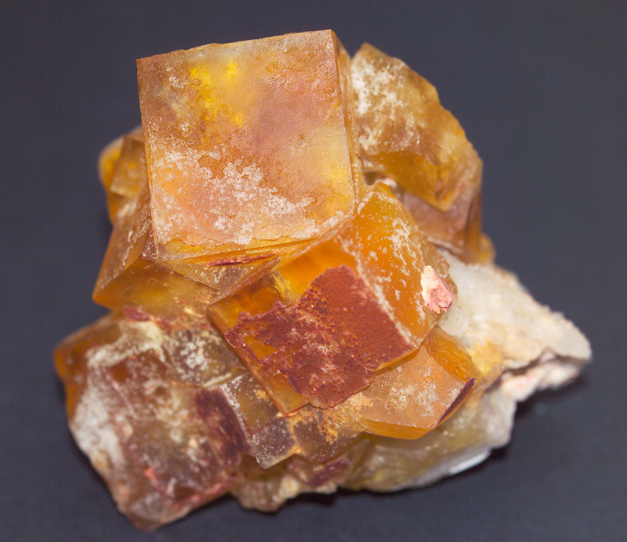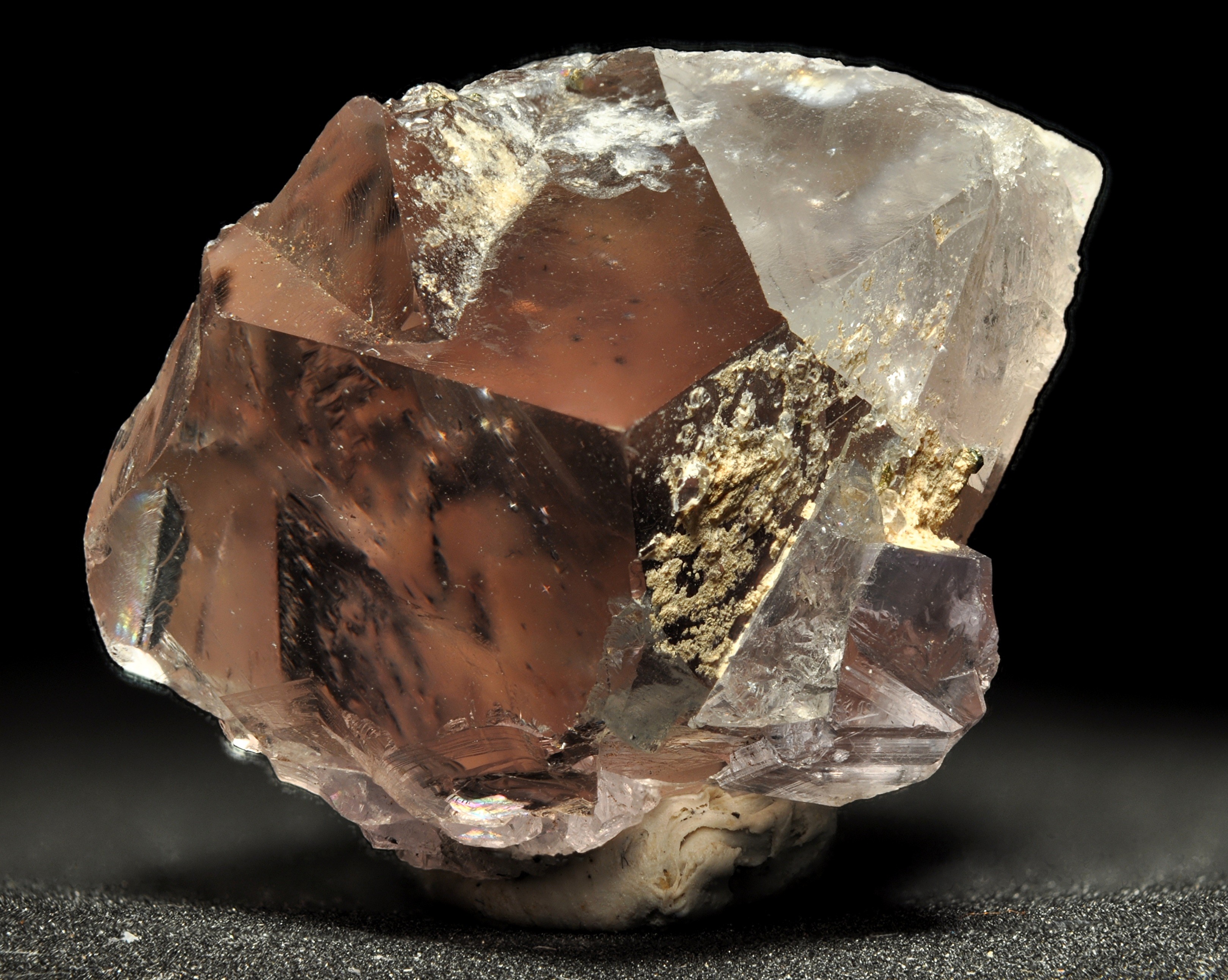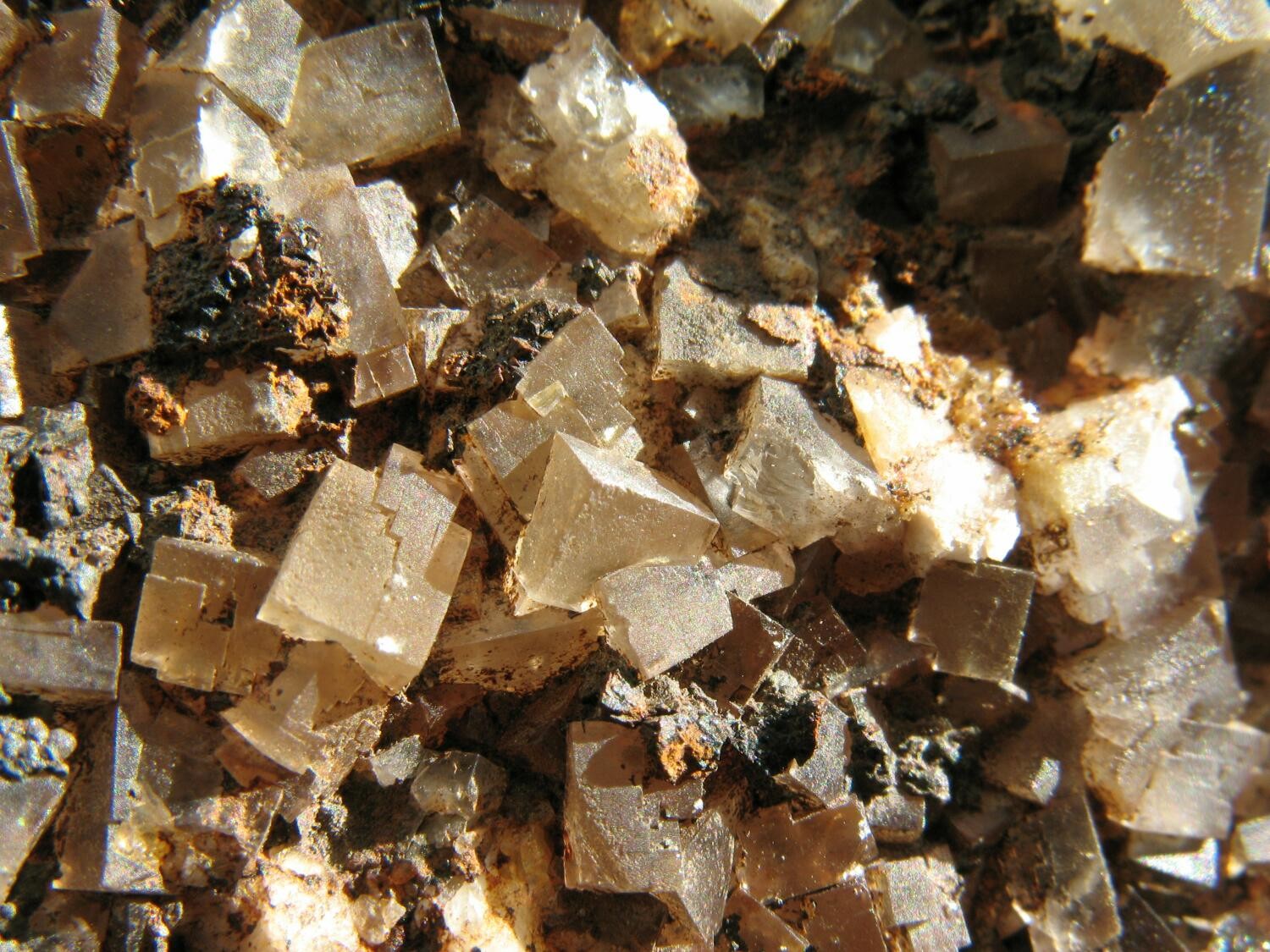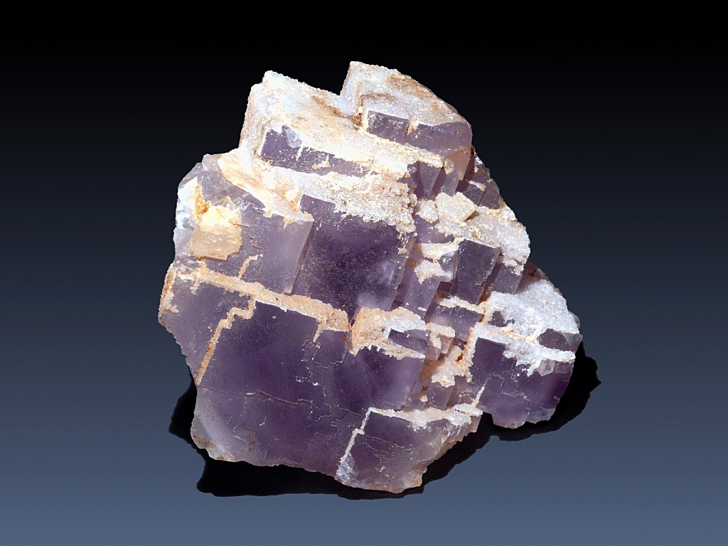 Bild 2: honig- bis malzbraune Würfel, im Kern gleichsam violett, auf Querrissen schimmernd. Von der Grube Sauberg, Ehrenfriedersdorf, Erzgebirge, Sachsen. Stufenbreite etwa 7 cm.