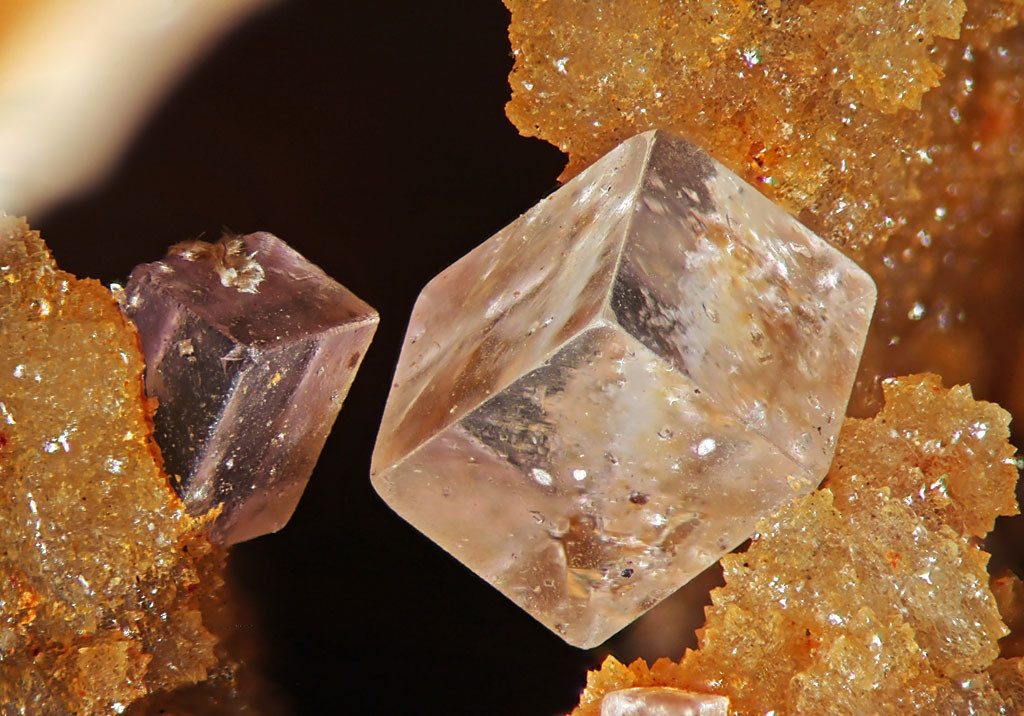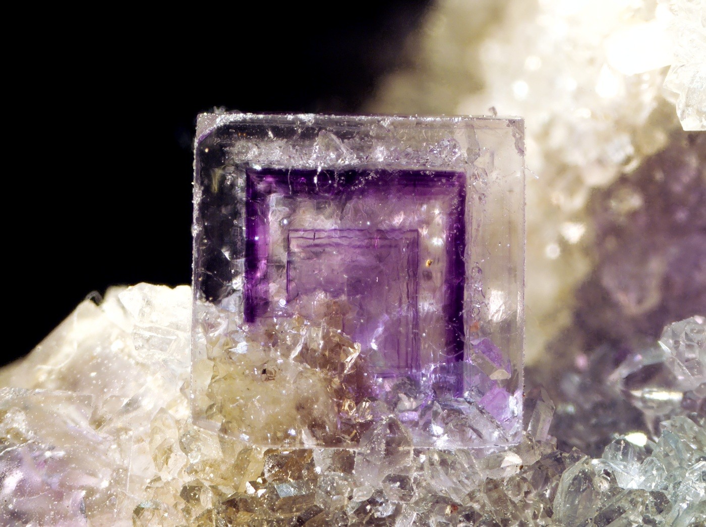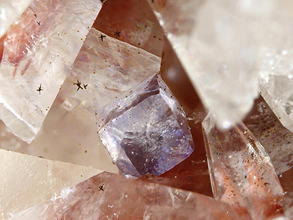 Der Fluoritkristall zeigt gut sichtbar frühere Wachstumsphasen als Phantom. Die vorletzte Wachstumsphase (äußerer violetter Phantomwürfel) wurde mit klaren Quarzkristallen "überzuckert", dann ist der Fluorit klar weitergewachsen und hat die Quarzkristalle vollkommen eingeschlossen. Bildbreite 8 mm, FO: Berbes -Spanien.