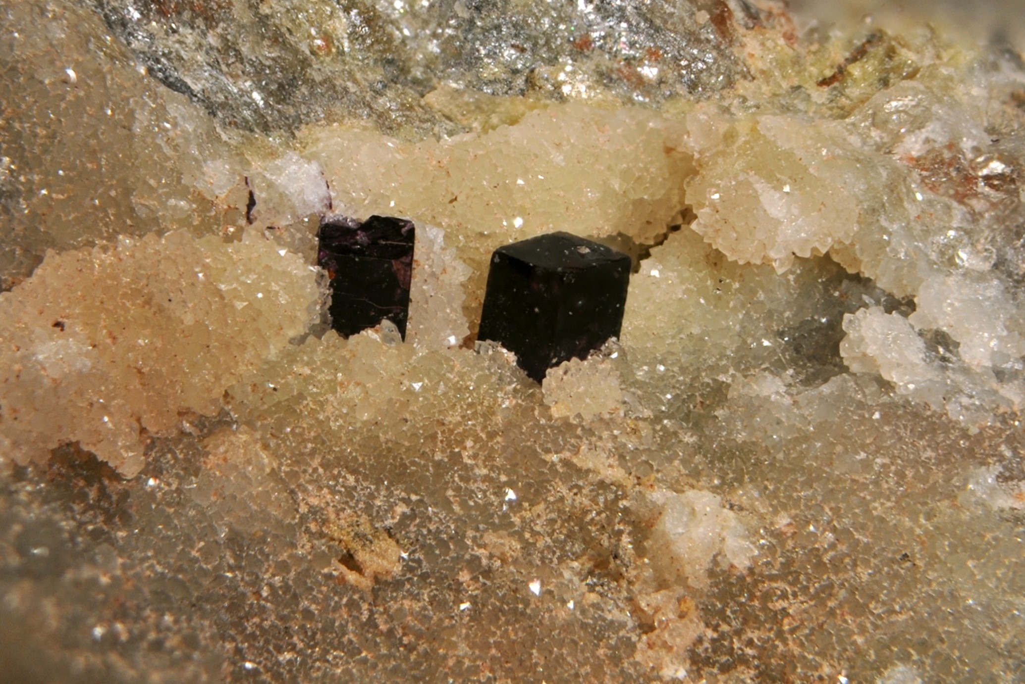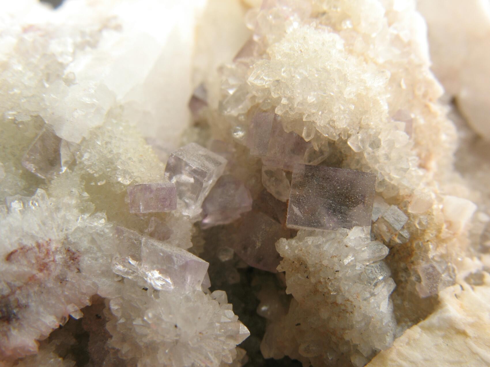 Bild 1: Fluorit mit Clacit, Stbr. Artenberg, Schwarzwald. Bildbreite: 5,8 mm