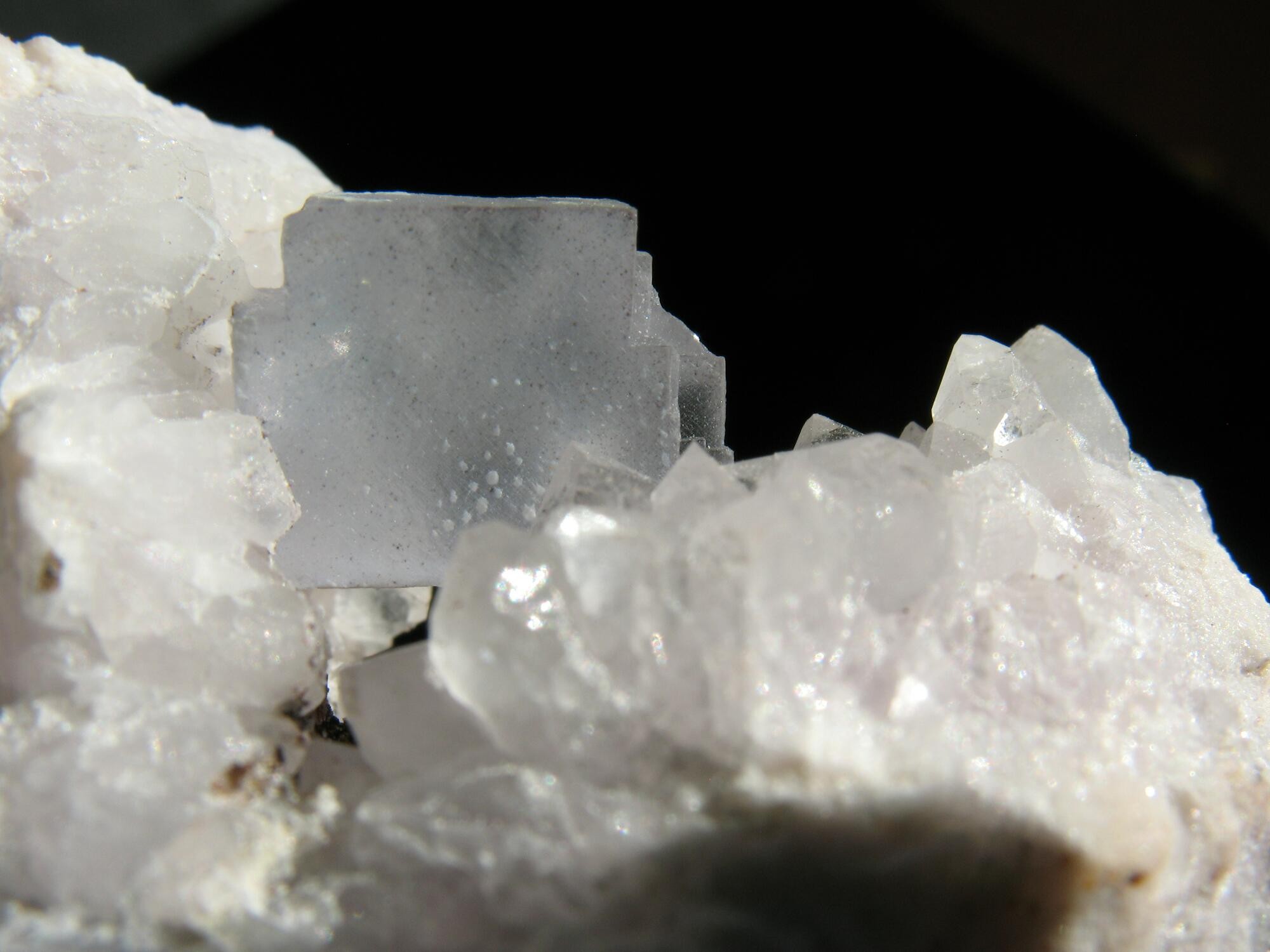 Bild 3: fast schwarzer Fluorit auf Quarz von der Schachthalde 139, Lauta, Marienberg (Bildbreite: 1 cm)