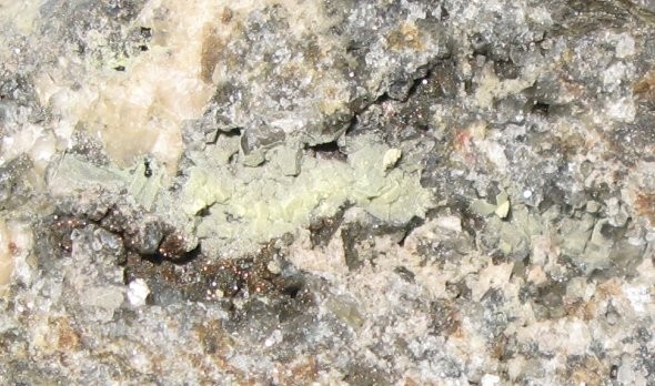 Bei dem gelben Mineral ist es nicht so ganz einfach. Wenn es wirklich fluoresziert, dann könnte es Metauranospinit oder Bergenit sein. Auch letzterer ist eindeutig von der 139 nachgewiesen. Uranophan ist anders ausgebildet und somit auszuschließen.