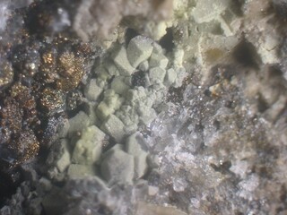Der Vorschlag der Umhüllungspseudomorphose von Jens ist nicht schlecht, aber hier würde ich paragenetisch bedingt sagen, dass es Metazeunerit ist. Dieser kommt in genau der gezeigten Färbung von der 139 vor. Häufig sitzen die extrem kleinen tafeligen Kristalle mit abgerundeten Ecken (unter dem Elektronenmikroskop erkennbar) auf violetten Fluoritwürfeln. Und das überzogene Mineral hat eindeutig Kristallformen des Fluorites.