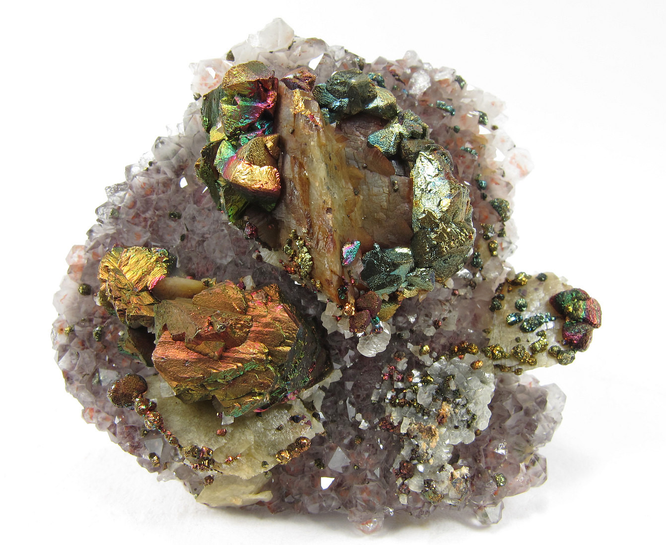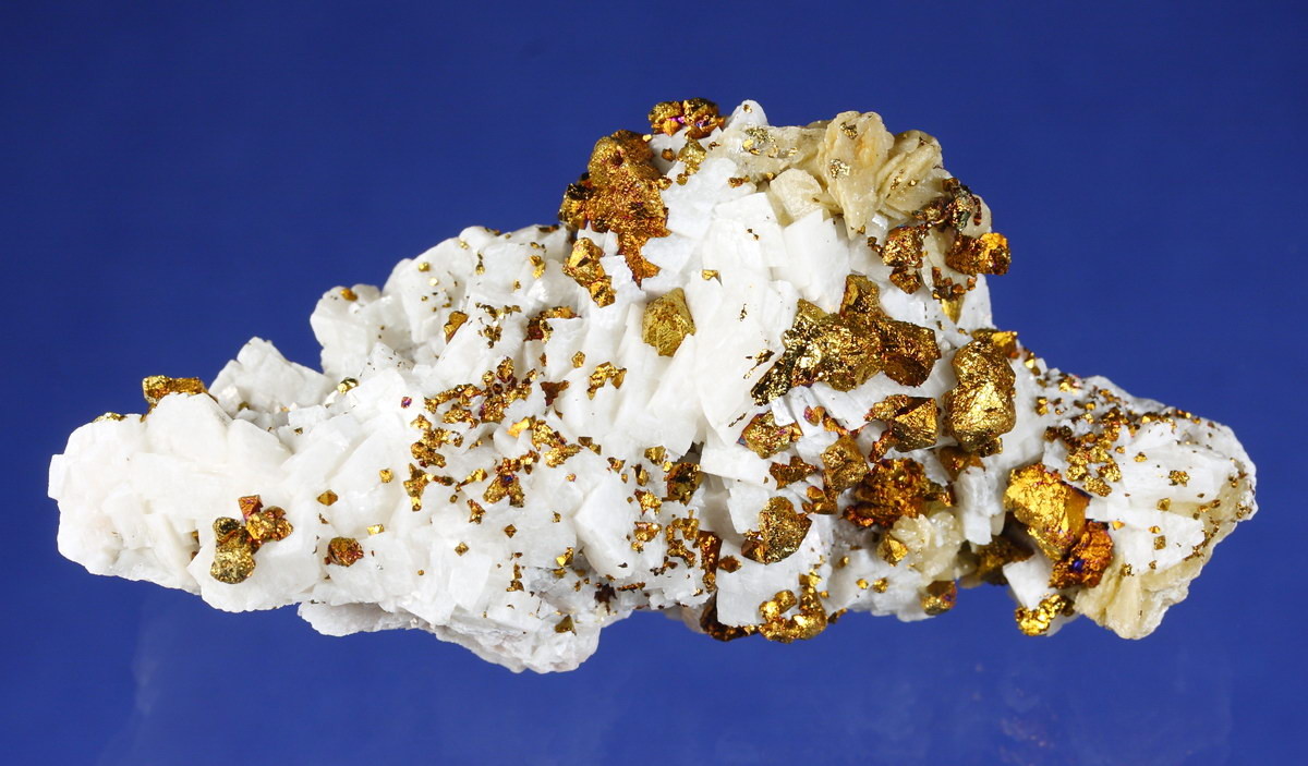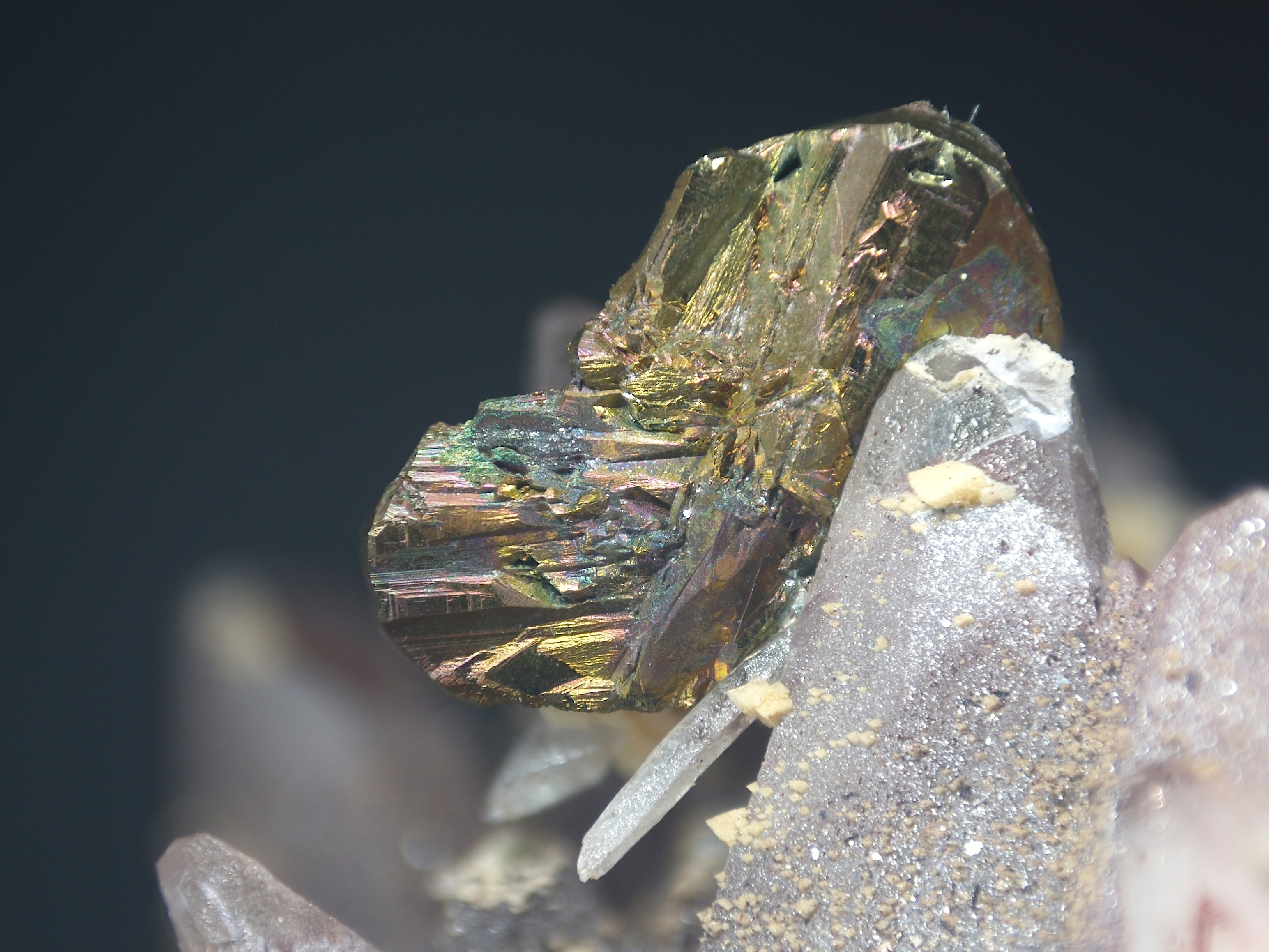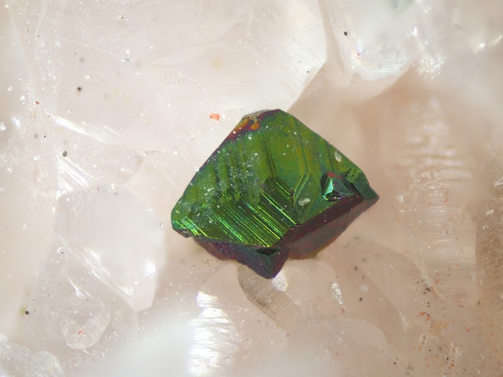 Ein Chalkopyrit mit Anlauffarben auf Calcit. Daneben noch einige Dolomitkristalle auf den Calciten.