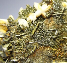 Es handelt sich also um eine Pseudomorphose von Pyrit nach Pyrrhotin. Auf den Kristallen sind zahlreiche Arsenopyrite gewachsen. Die Kristalle sind recht lang, dünn, dreiseitig und das Dreieck ist gleichschenkelig. Spricht auf jeden Fall für Arsenopyrit. In Zwischenräumen sind auch freigewachsene Kristalle erkennbar.