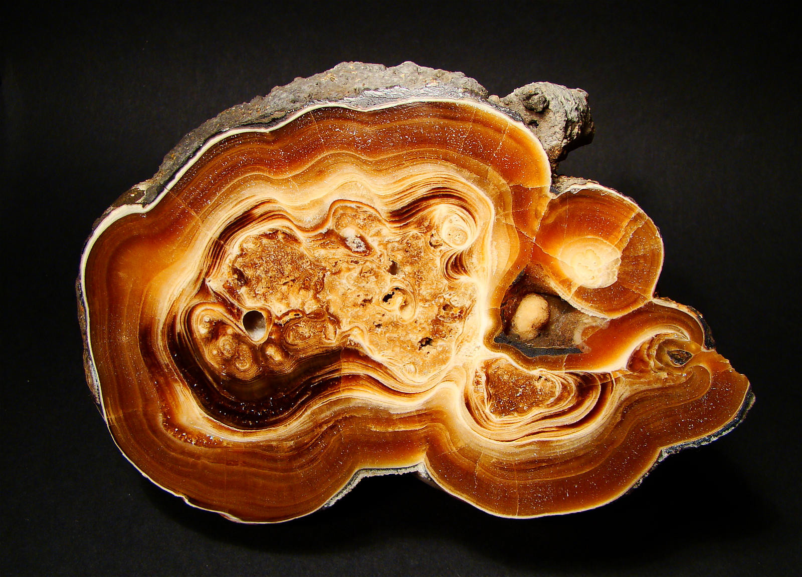 Daran siehst du doch,daß eine lagenförmige Abscheidung der Minerale erfolgt und keine Umwandlung (Pseudomorphose).