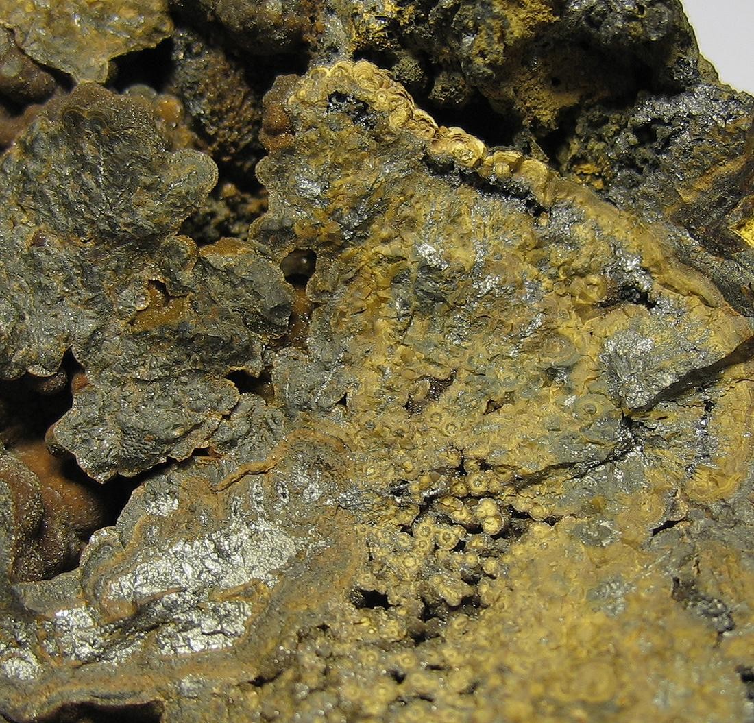 Die silbrigen Massen sind Geokronit, an den Rändern der Stufe befinden sich Geokronitblasen, wie sie in der Lapis Dez. 1985 beschrieben werden. Auch die gelben Pusteln werden in der Lapis beschrieben (S. 27, Bild S. 30) - als Hutchinsonit. Genauso schauen meine aus. Mit Loch in der Mitte, stellenweise noch rote Reste. Auripigment ist auszuschließen, dieser kam in Form flacher Sonnen vor, wie man sie von Wavellit zwischen Schieferplatten gewachsen kennt.