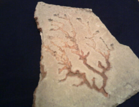 Deine Vermutung ist soweit schon richtig, mit Lebensspuren hat das nichts zu tun. Vielmehr hat hier kalklösendes Wasser denselben Weg genommen, den zuvor auch dendritenabscheidende Lösung genommen hat, einfach, weil dieser durch die Oberflächenbeschaffenheit der Schichtflächen vorgegeben war. So entstand ein "Negativdendrit" durch Kalklösung.