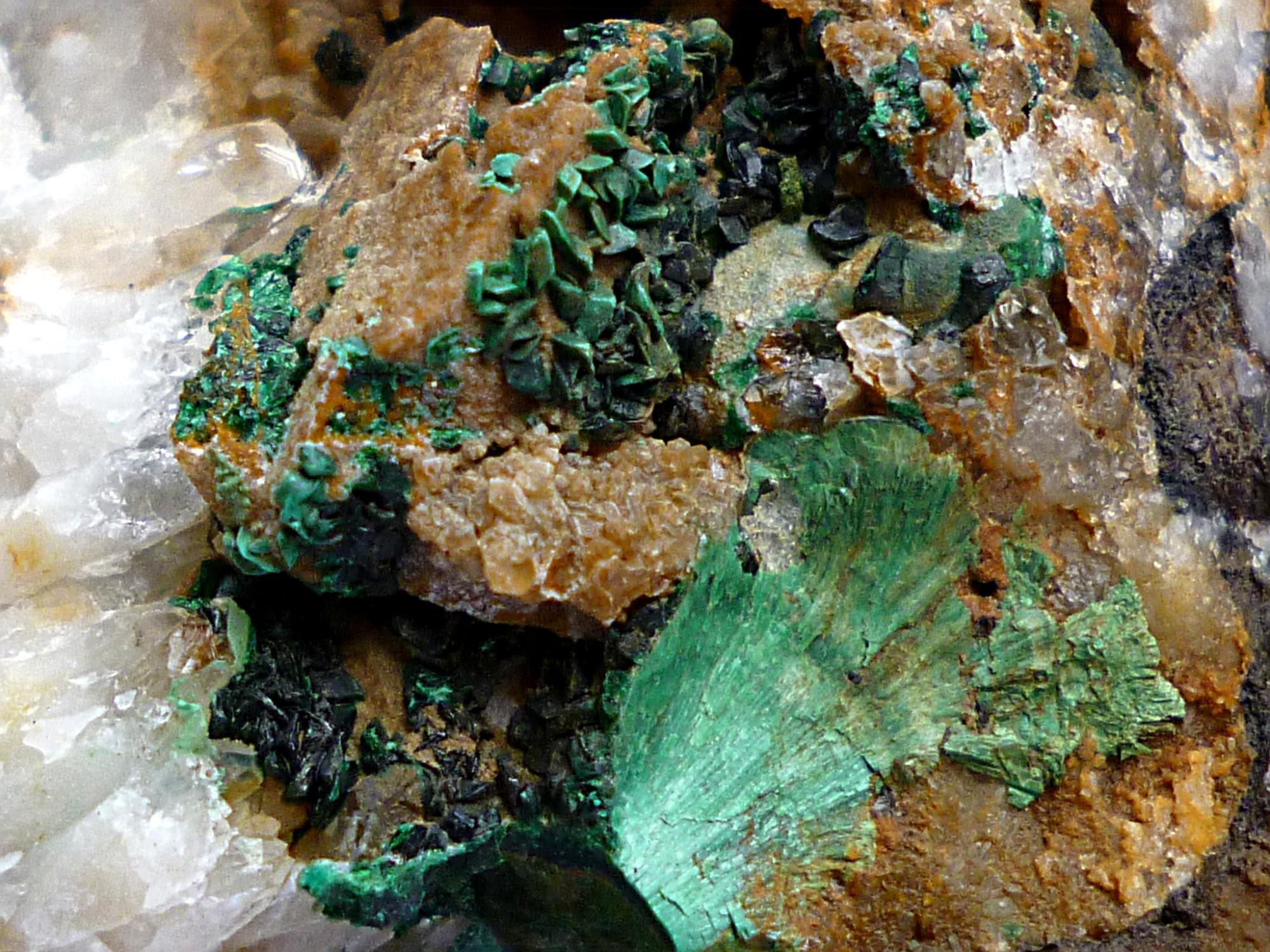 Pseudomalachitkristalle neben Malachitgarbe, Bildbreite ca. 25 mm; Fundort:Siebenhitz/Joditz/Hof/Frankenwald, Fund Mai 2011