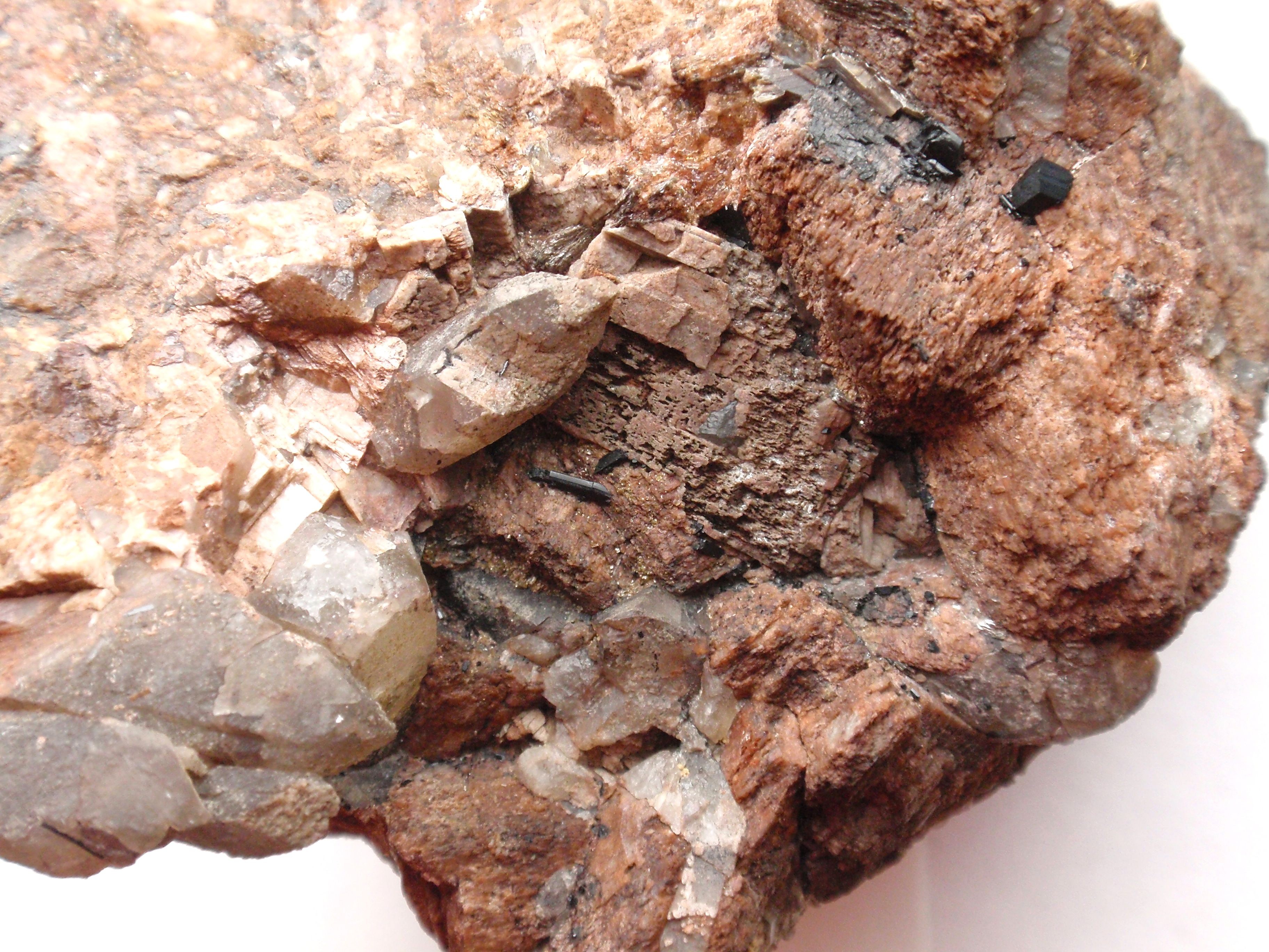 am 25.5.2011 habe ich in losen Granulit-Blöcken mit pegmatischen Granitgängen in einem Hohlraum Schörl, Quarz und Orthoklas gefunden. Der Orthoklas ist stark korrodiert, der Schörl tw. mit Kopfflächen.