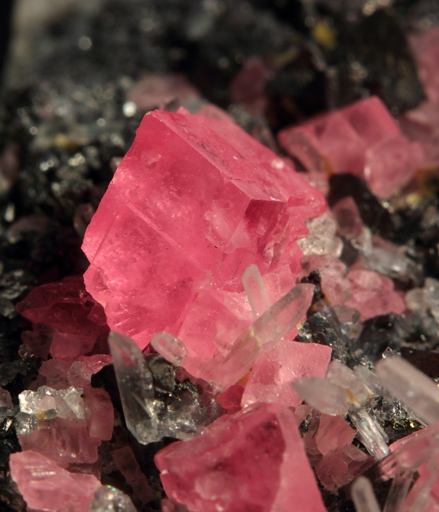 Rhodochrosit mit Nadelquarz und Tetraedrit, Bildbreite: 1,4 cm