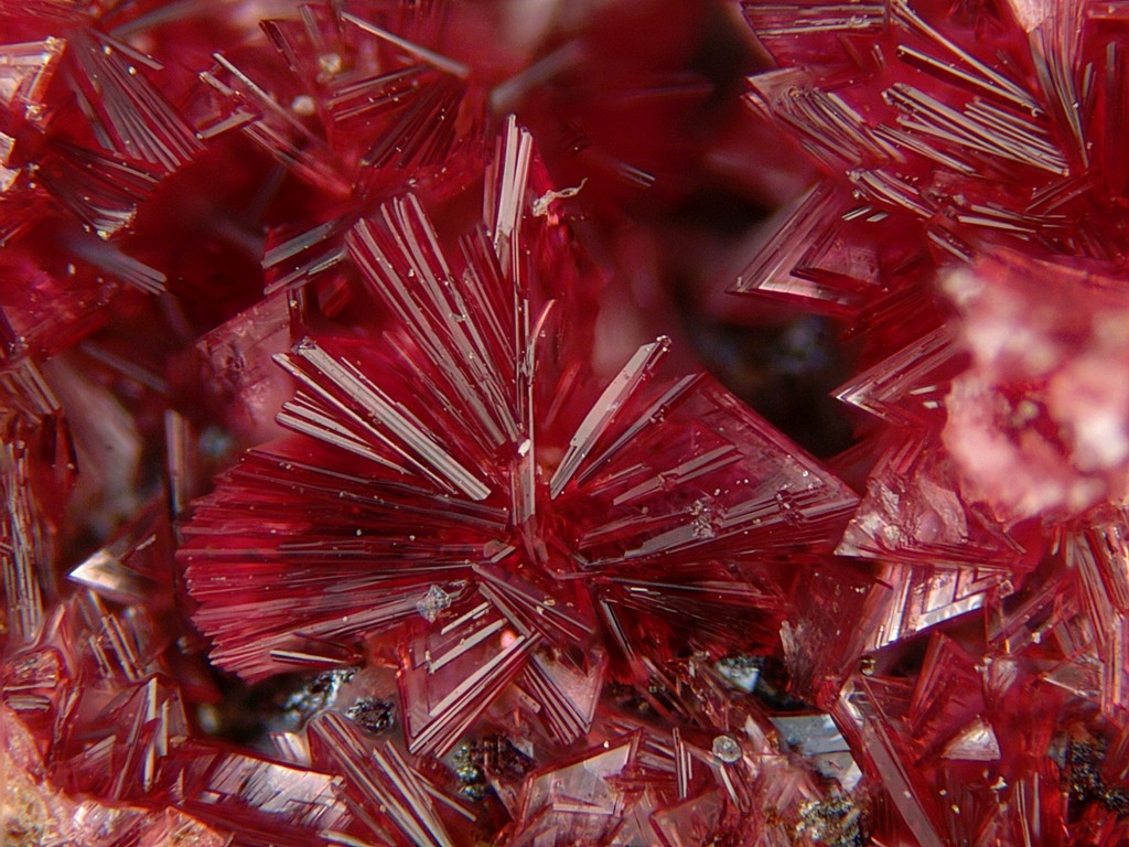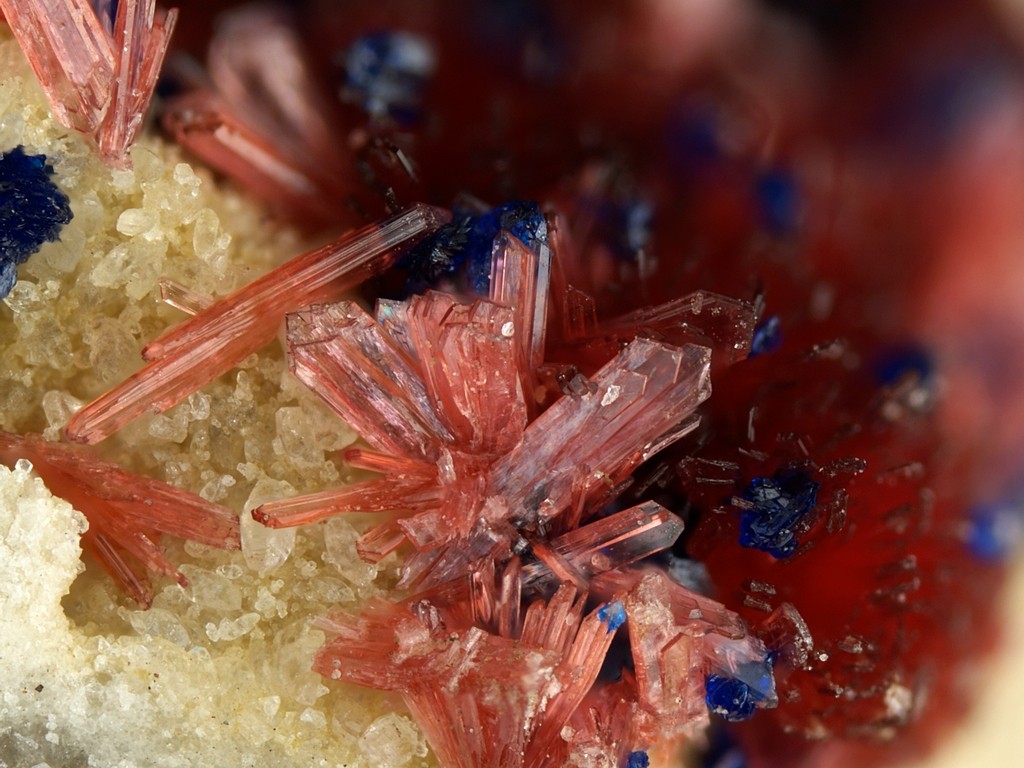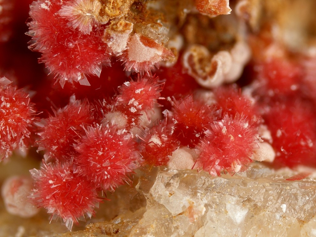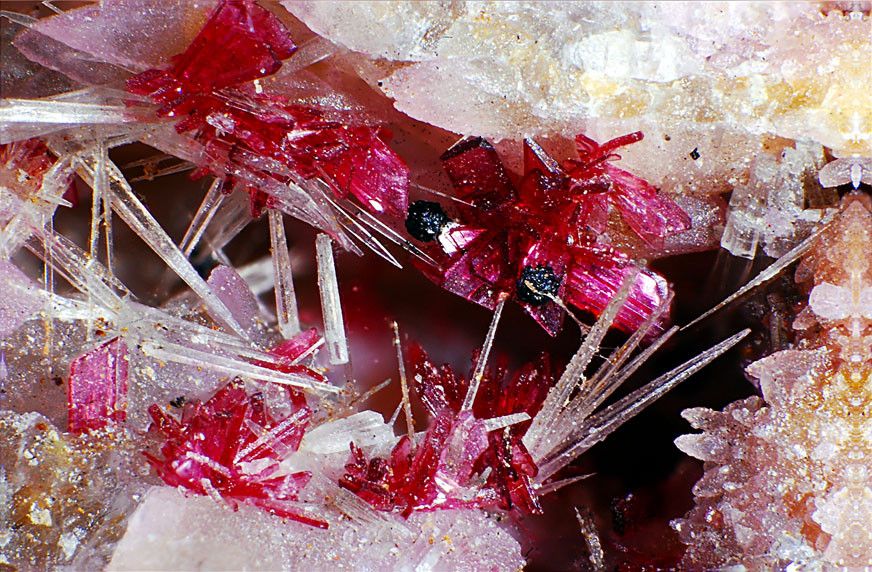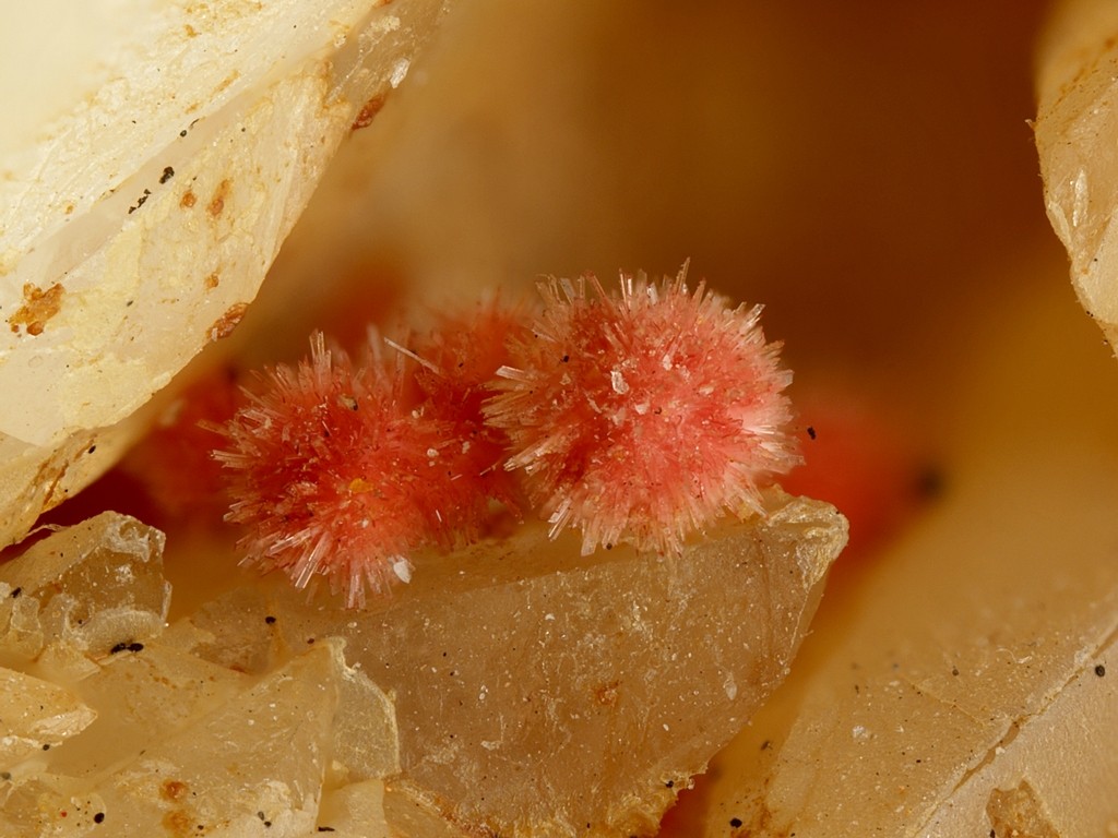 Erythrin* auf Calcit**, Bildbreite etwa 6,5 mm.