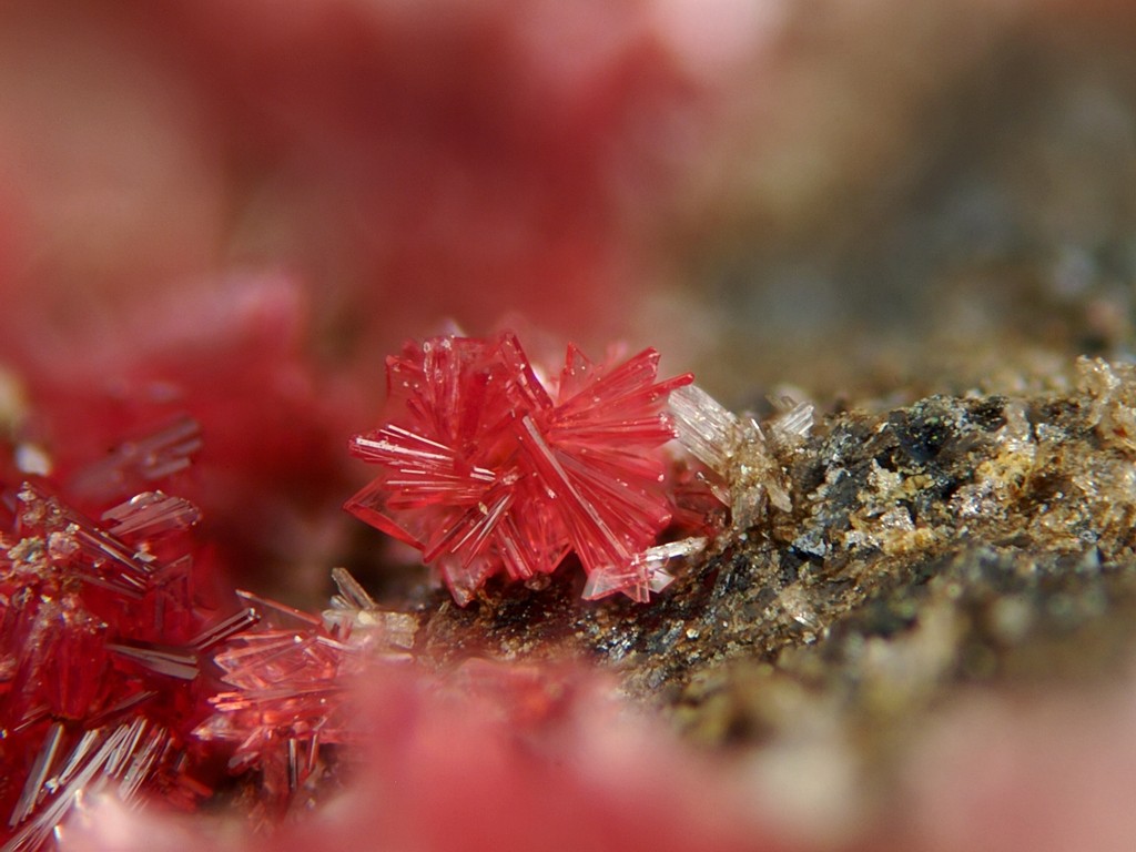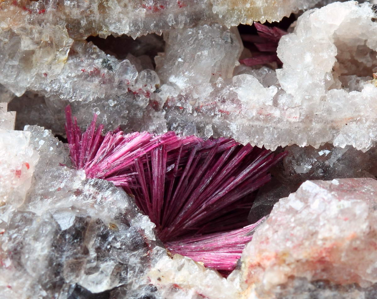 Erythrin xx bis 0,6 cm auf Quarz, Bildbreite 1,5 cm