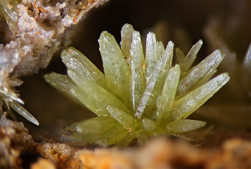 Foto 2: Ebenfalls von der Grube Friedrichssegen, weißgraue Pyromoprhitkristalle. Auch eine Eigenfund von der Halde aus dem Jahre 1983. Bildbreite 6x4,5 mm.