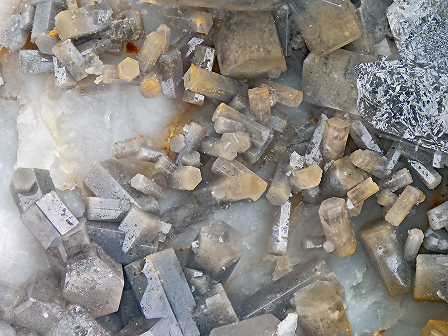 Foto 3: Ein Klassiker, grauweiß bis gelbbraune Kristalle von der Grube Kautenbach im Hunsrück. Der große Kristalle hat einen Durchmesser von 2,5 cm.