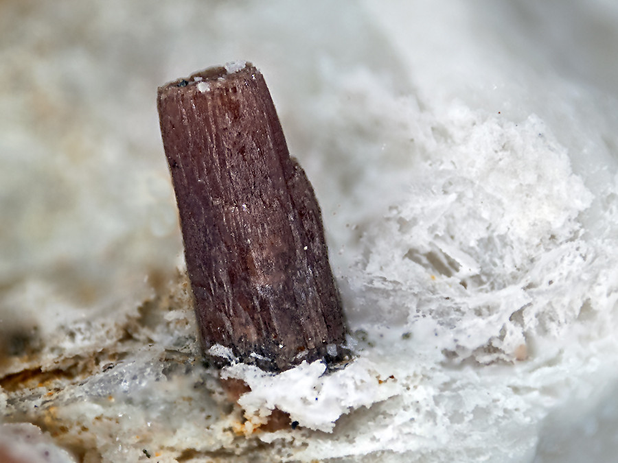 Foto1: Eine Kleinstufe von der Grube Friedrichssegen mit einem 1 cm hohen Kristall auf dem typisch zerfressenen Quarz. Ein Eigenfund auf der Halde aus dem Jahre 1983.