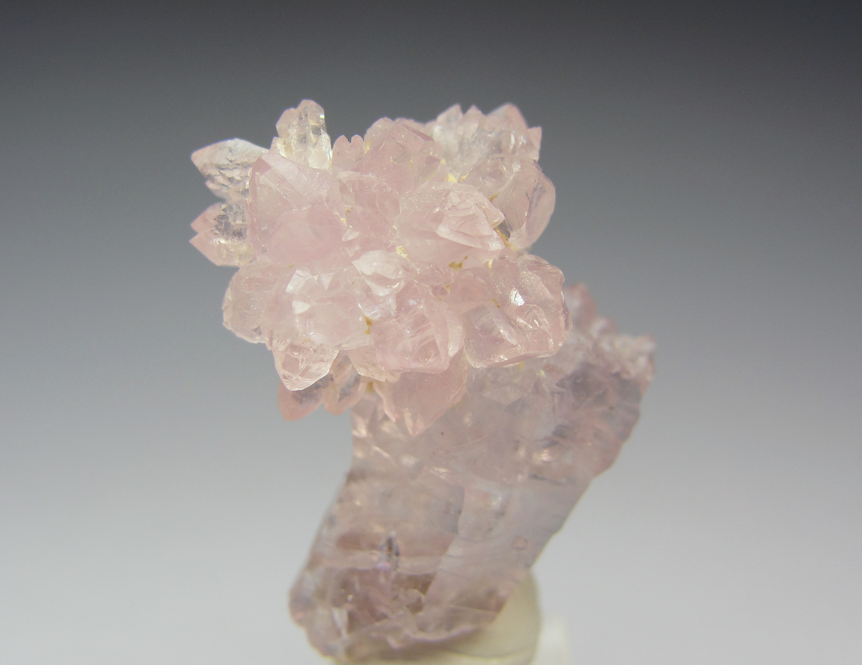The other variety occurs in well-formed crystals of similar color. They are found as a late formation in pegmatite pockets, often overgrowing smoky quartz crystals in groups of parallel-grown crystals. The color is apparently caused by irradiation induced color centers based on aluminum, Al, and phosphorous, P, that replace Si in the atom lattice (Maschmeyer, Lehmann, 1983). The color is both very light- and heat sensitive. The crystals are slightly dichroic. Because of the differences in their physical properties and causes of color it has been suggested to give the variety of rose quartz that forms crystals the name "pink quartz"