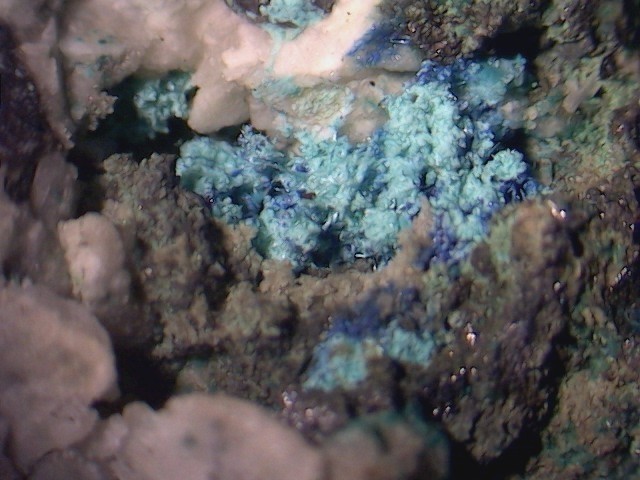 - dazu kommt, dass er zwar Quarz und Calcit, nicht aber dieses dunkel grau-blaue Material erwähnt, sowie, dass man die von ihm beschriebene, Widder-/Füllhorn-artige Form der Aggregate auf dem Bild nicht erkennt – was nichts heißen muß …aber könnte. (nämlich, dass Beschreibung und Bild nicht zusammen gehören)