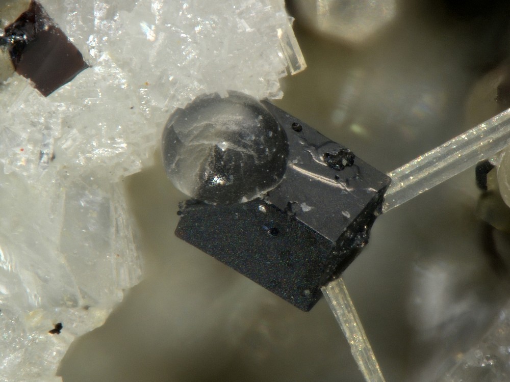 ich denke, die Beschriftung bei diesem Foto ist falsch. Die klare Kugel auf dem Perowskit ist wohl kein Thaumasit wie angegeben sondern eher Thomsonit.