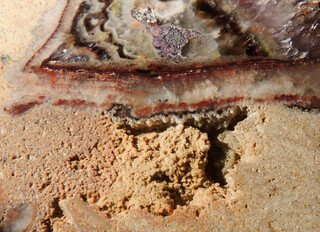 Teilweise lagig wie Sandstein und teilweise porig wie Travertin.An der Grenze zum  Amethyst selbst keinerlei Hohlräume.Da ist alles bündig!