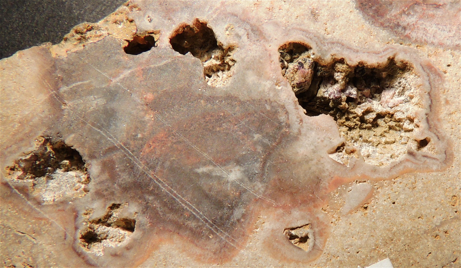 Teilweise lagig wie Sandstein und teilweise porig wie Travertin.An der Grenze zum  Amethyst selbst keinerlei Hohlräume.Da ist alles bündig!