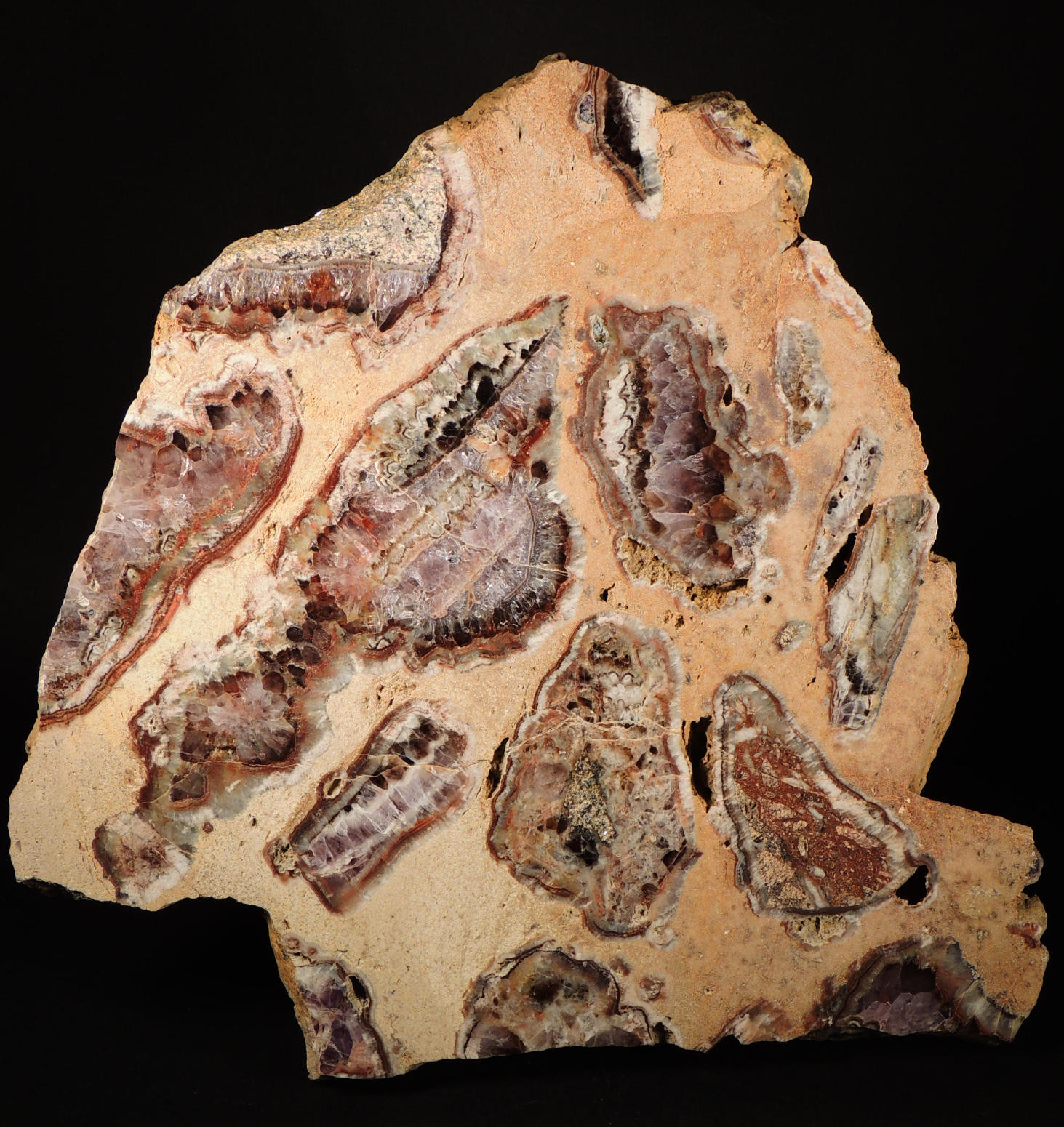 Sehr schön finde ich allerdings in den Detailbildern die äußere Umrahmung der einzelnen Amethysttrümer.Die müssen auf jeden Fall in Kieselsäure gesättigter Lösung geschwommen (geschwebt) sein.