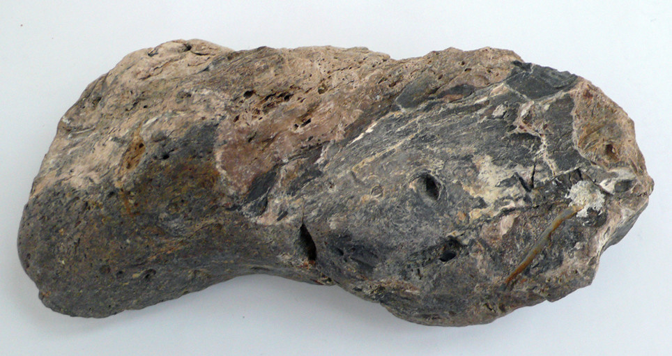 Manche der Pflanzenreste darin sind nur als Abdrücke erhalten, was an der wiederum teils kieseligen, teils aber auch etwas kalkigen Erhaltung liegt. Die kieselige Grundmasse ist überwiegend dunkelbraun bis kohlig schwarz, im Gesamten erinnert mich das Stück an ähnliche Funde aus den oberösterreichischen Braunkohlegebieten (z.B. Trimmelkam oder Hausruckgebiet/Umgebung Ampflwang). Damit – und mit den geologischen Verhältnissen im Fundgebiet – scheint die ursprüngliche Herkunft des Stückes aus einem miozänen Braunkohle-Küstensumpf relativ eindeutig. Ich denke da an die Kohlevorkommen  (und damit verzahnte Sedimente) am Ostrand der Böhmischen Masse, also vor allem die Langau- und die Riegersburg-Fm (bzw. damit vergleichbare, heute großteils wegerodierte bzw. nur in minimalen Resten erhaltene Sedimente) aus dem Ottnangium (siehe z.B. Roetzel 2005). Der Wurzelboden könnte dann – bereits verkieselt/fossilisiert – bei der Transgression im Karpatium aufgearbeitet worden und zusammen mit anderem Schotter ins Meer gelangt sein.