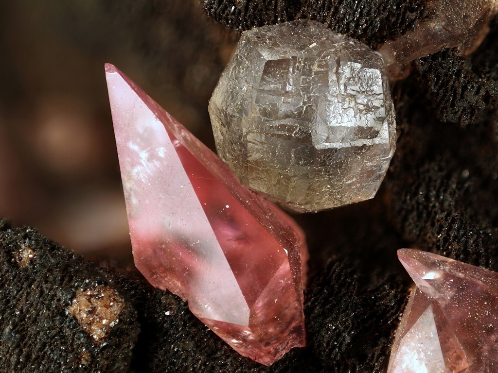 Rhodochrosit bis 2,5 cm. Oben Rechts ist der besagte Kristall