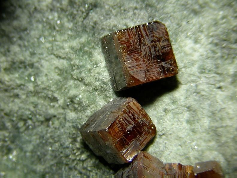 Ob es sich bei den Perowskiten tatsächlich um unverzwillingte Kristalle mit orthorhombischer Tracht handelt, oder es pseudokubische Zwillinge einer Verzerrung die zwei Würfelflächen verschwinden ließ, kann ich nicht sagen, beides wäre möglich.