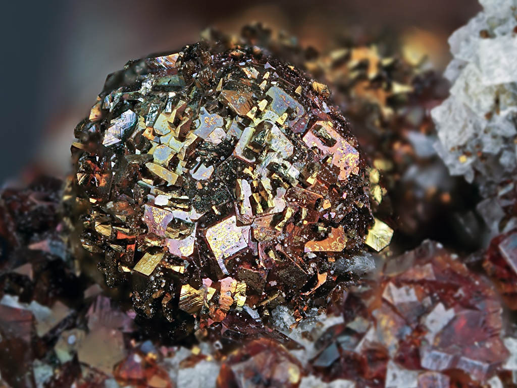 Eine Kugel bestehend aus Markasitkristallen in Paragenese mit Zinkblende. Fundort: Der Steinbruch Becke Öse. Bildbreite beträgt 2,82 mm.