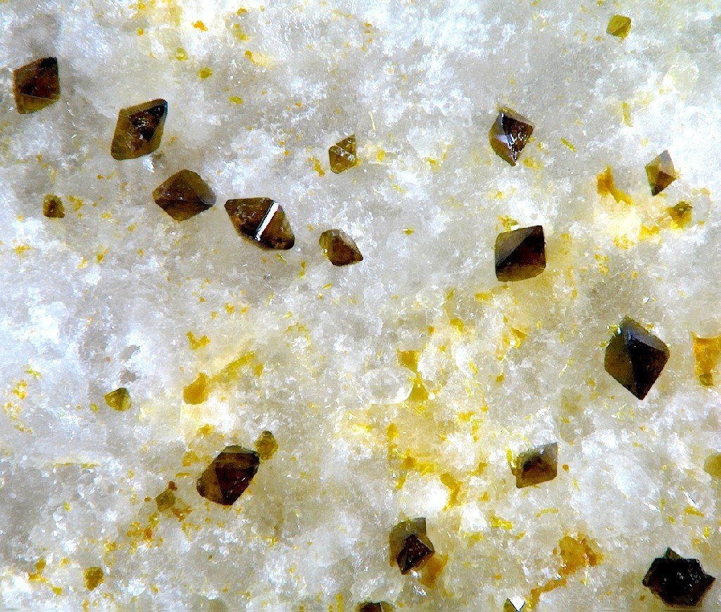 Hier sind schöne Wulfenite zu sehen und daneben dunklere kleinere ? (auch Wulfenit oder Vanadanit oder?)