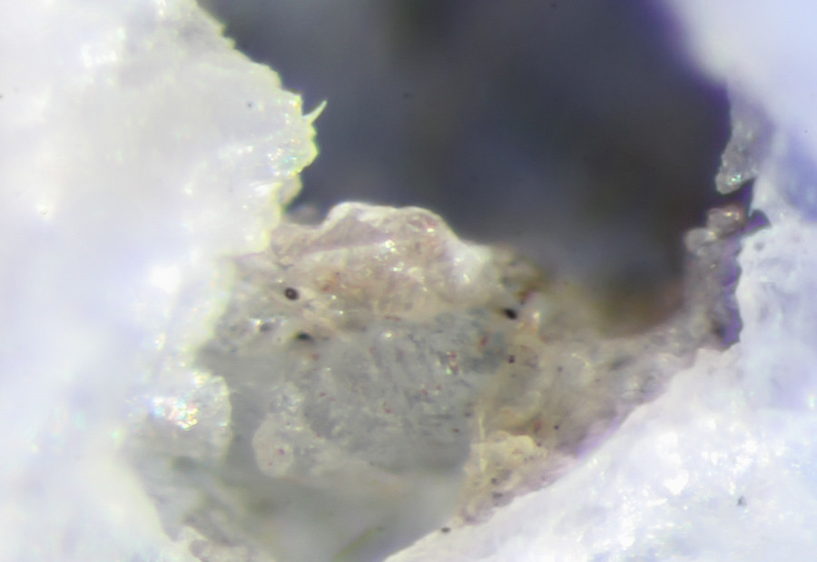 ich habe mir mal ein paar Brocken Sodalith aus Cerro Sapo vorgenommen. Neben Pyrit, Hämatit findet sich noch ein rosanes und ein brauner Mineral auf der Stufe. Leider sind die Dinger so winzig (100 fach optisch vergrößert aufgenommen) dass die Qualität stark leidet.
